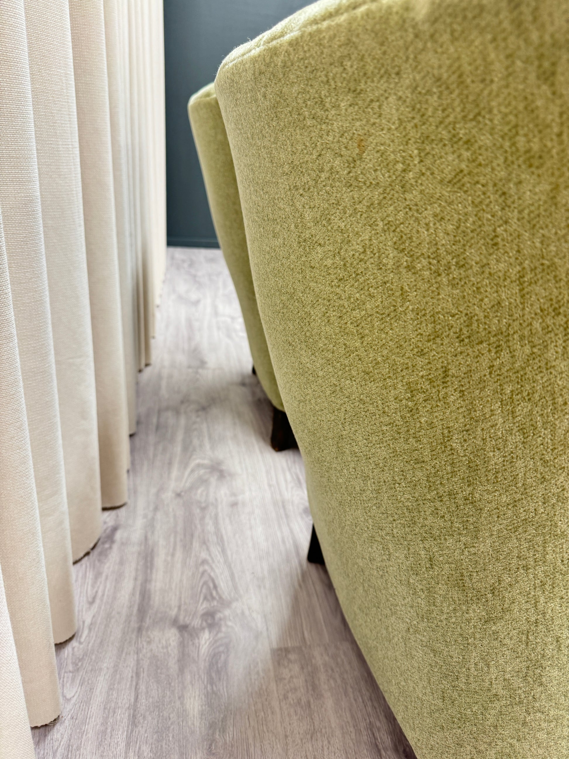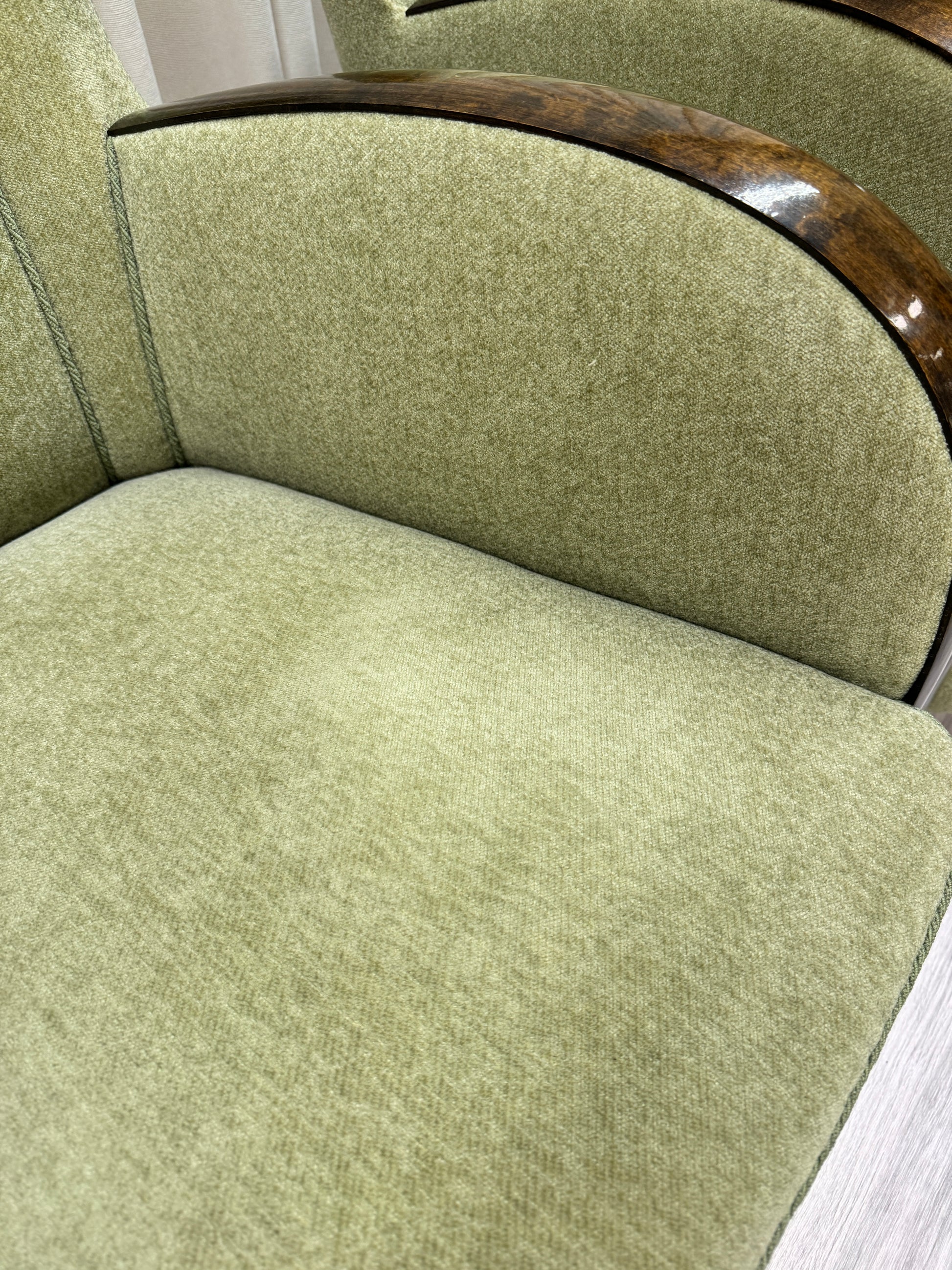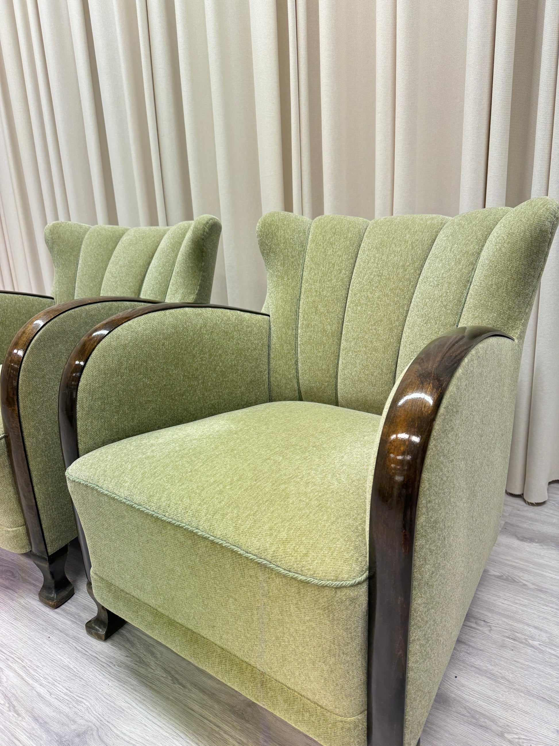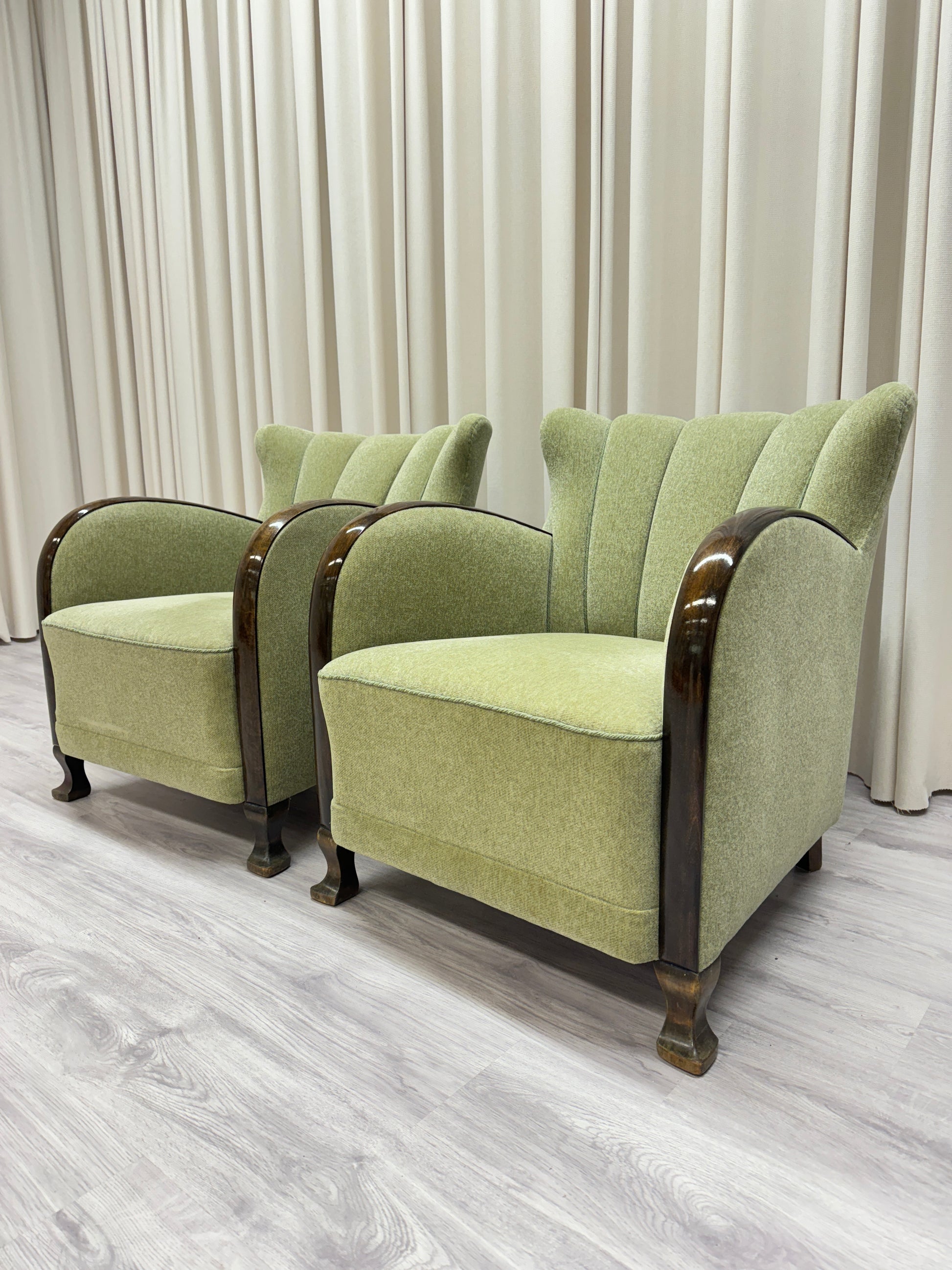 Kan endast hämtas ut i fysisk butik på Södra Kungsgatan 59 i Gävle. 2 st gröna Art Deco fåtöljer med böjträ. Tidigt 1900-tal. I gott bruksskick! Mått: Höjd 75 cm - Sitthöjd 42 cm - Djup 80 cm - Bredd 66 cm.