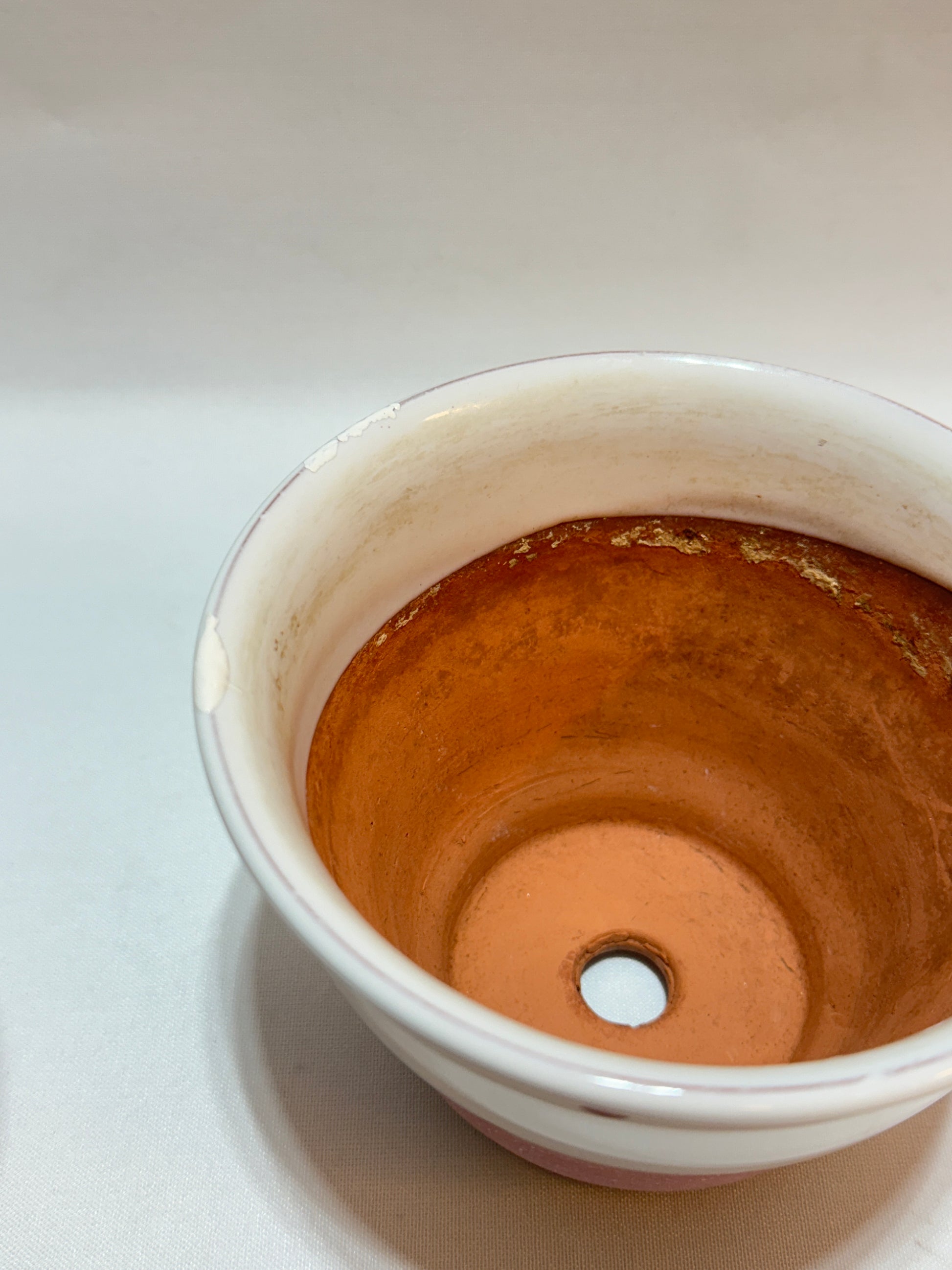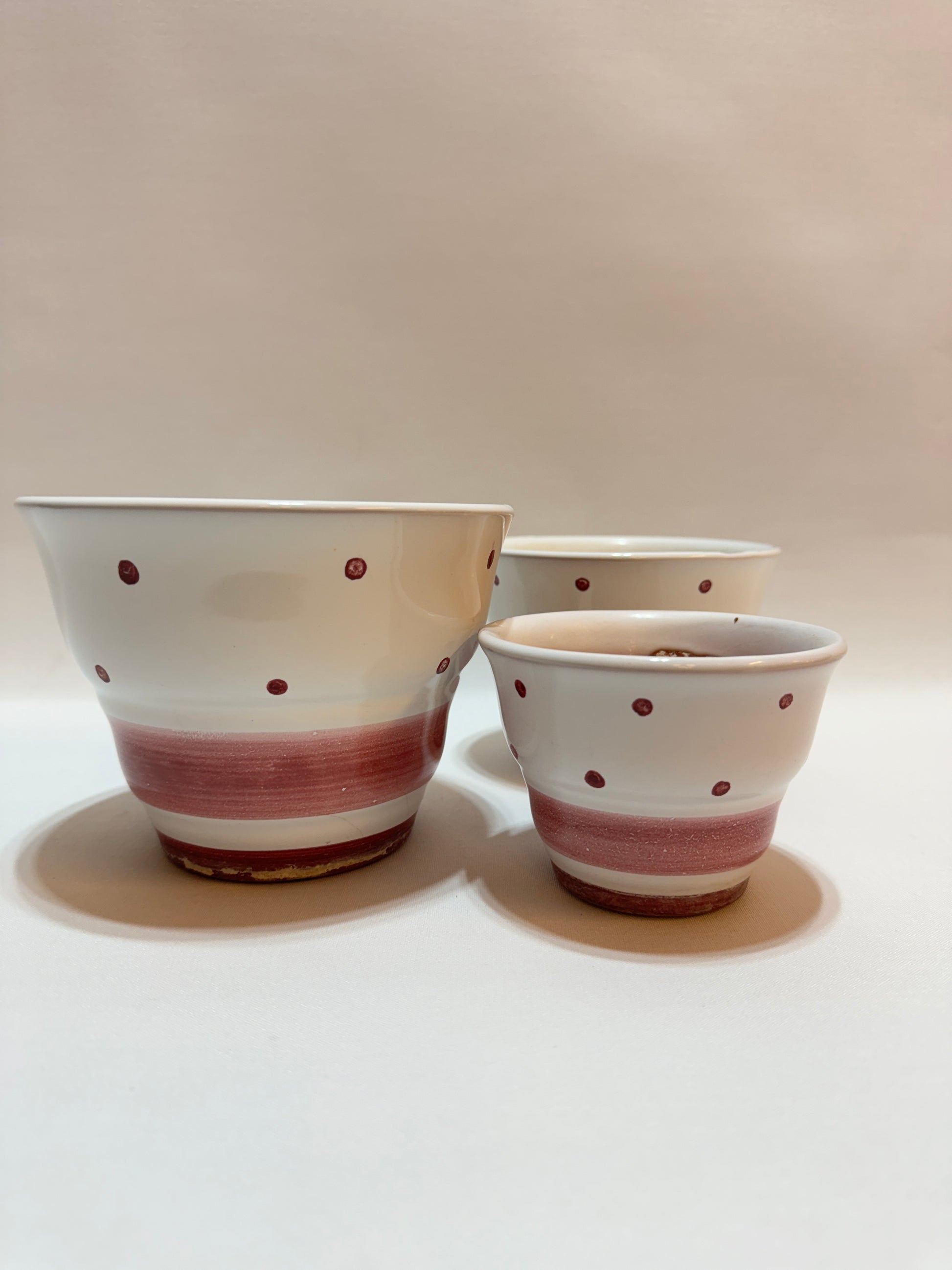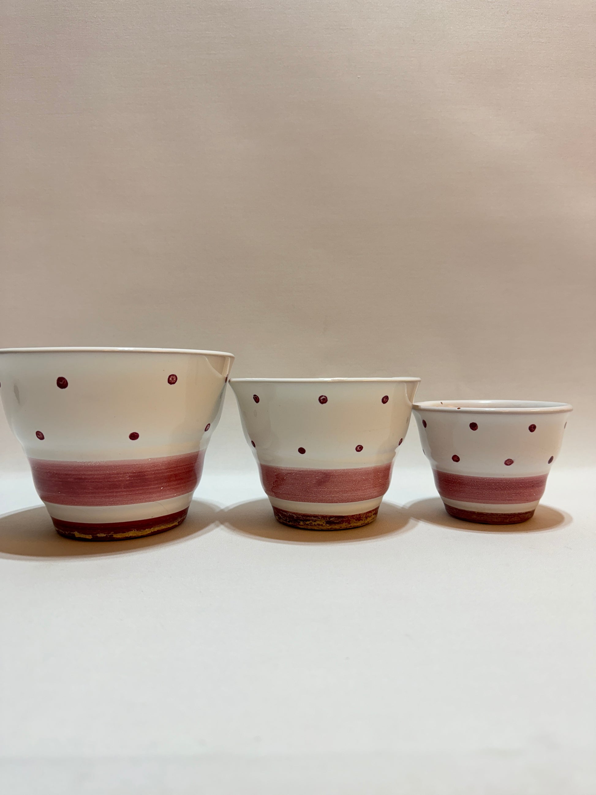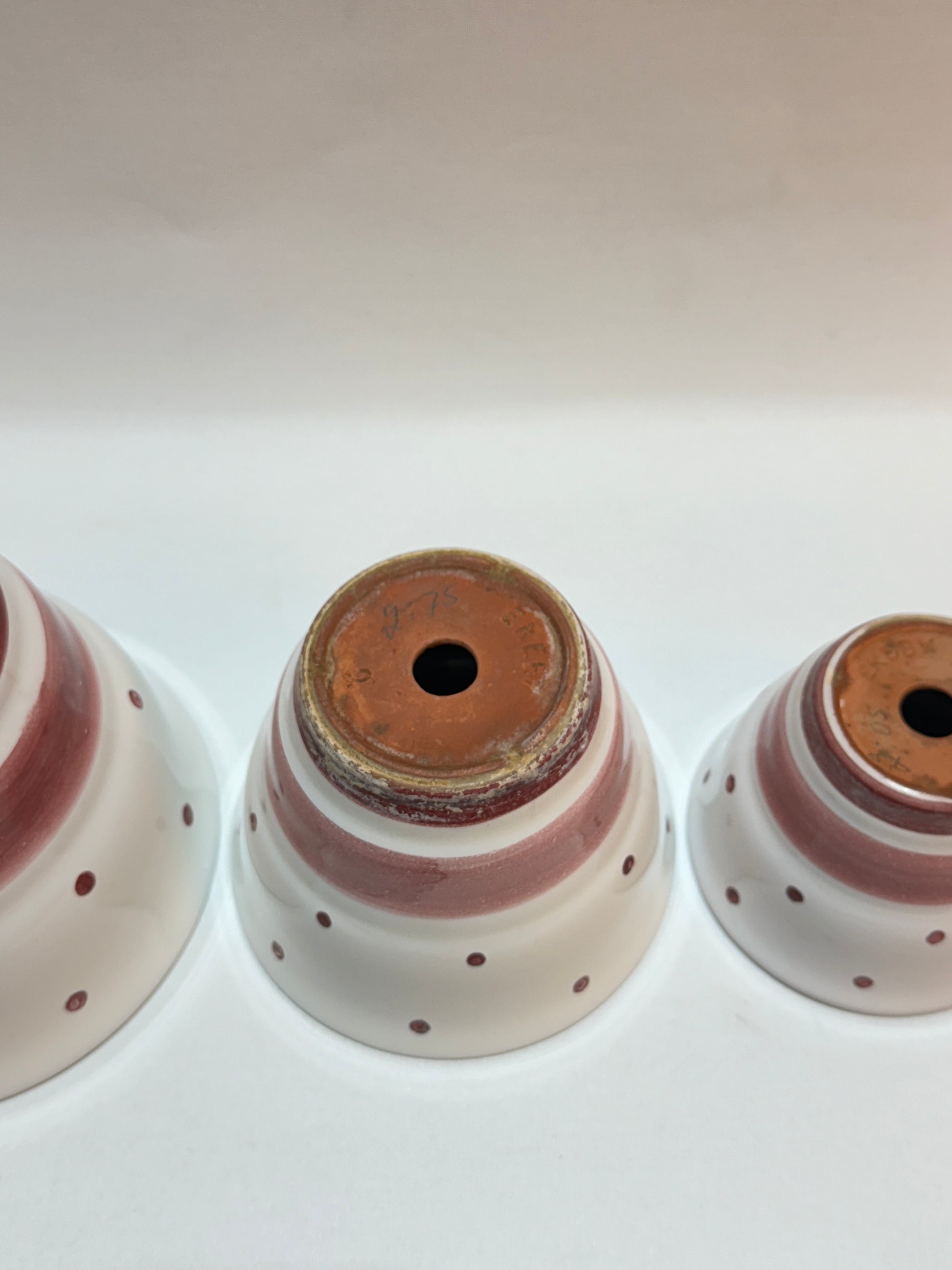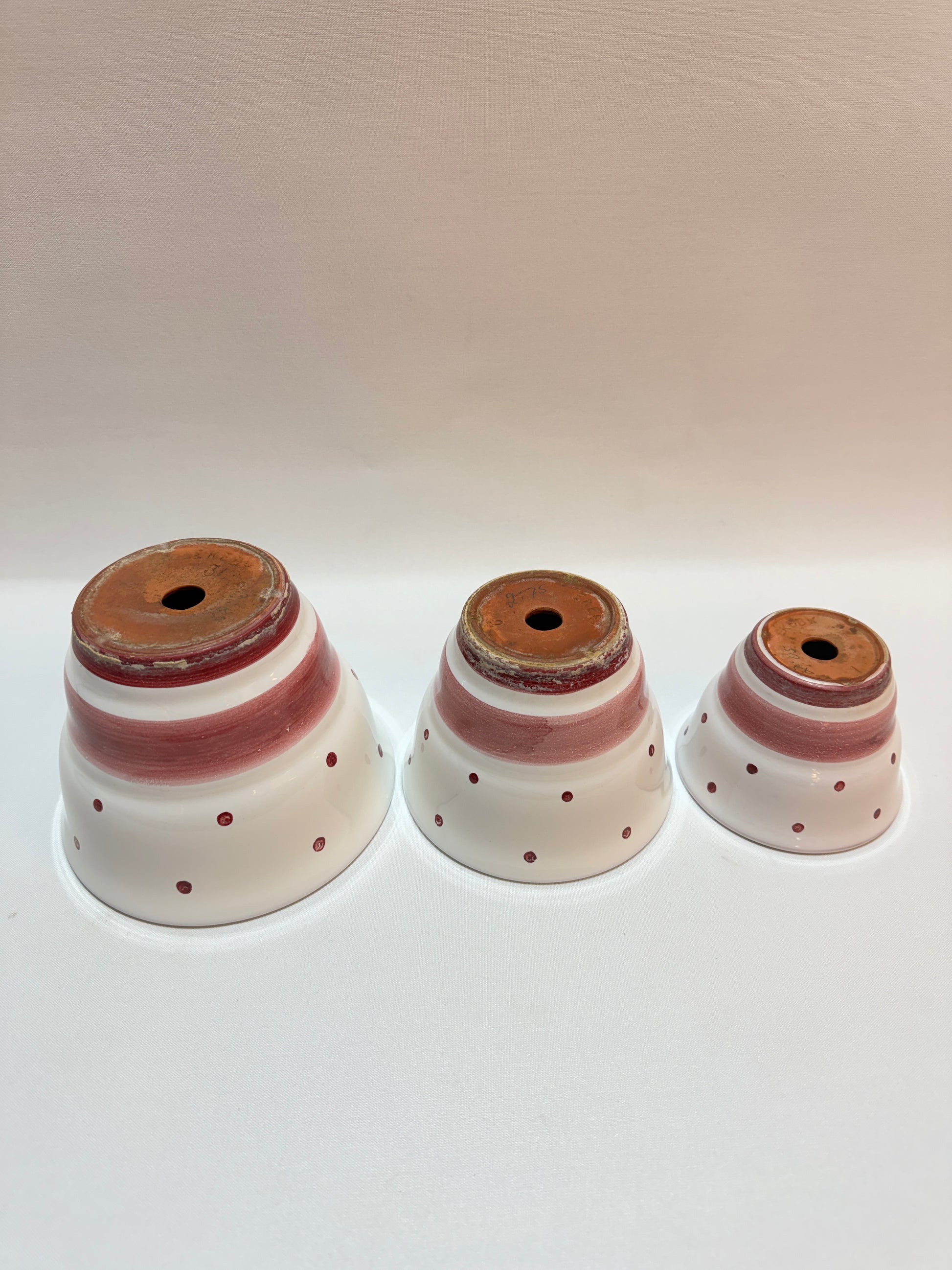 Höjd: 11,5 - 10,5 - 7,5 cm. Diameter 15, 13, 10 cm. Kalkrester, övermålningar. Små krackerlingar.