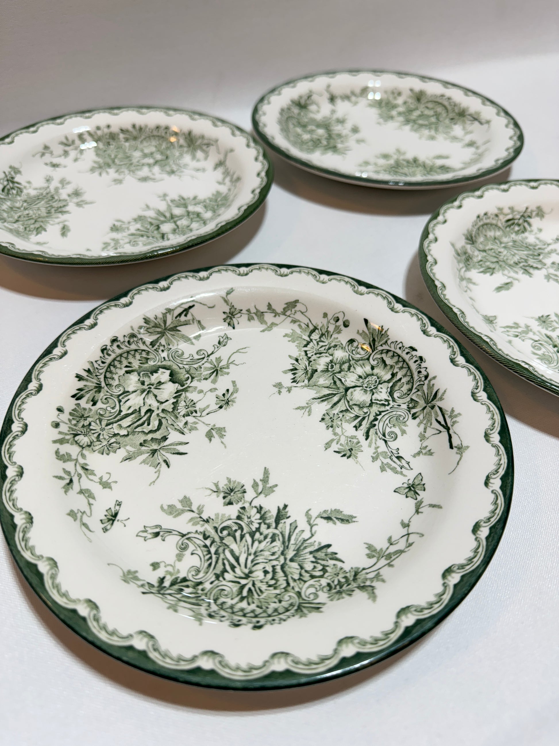 Diameter 18 cm. Assietterna kan pendla i grönhet, stämplar och kant. Samtliga i gott bruksskick!