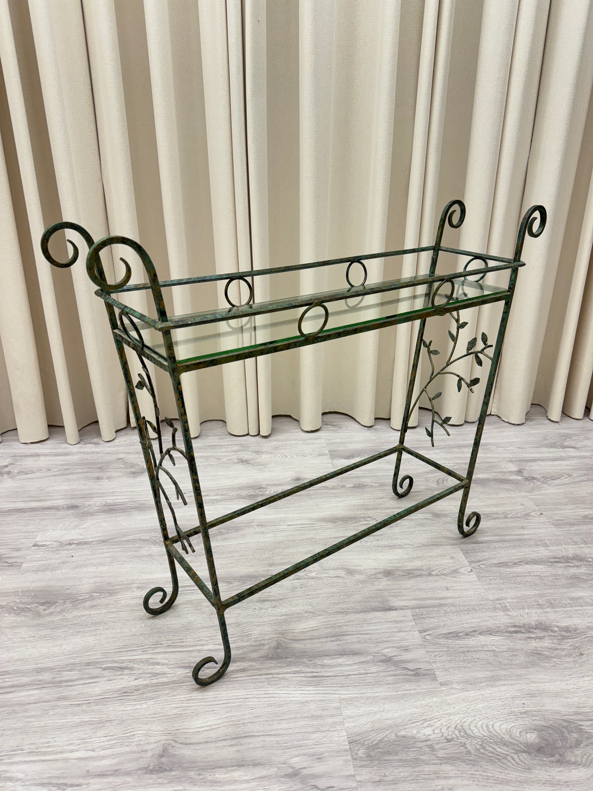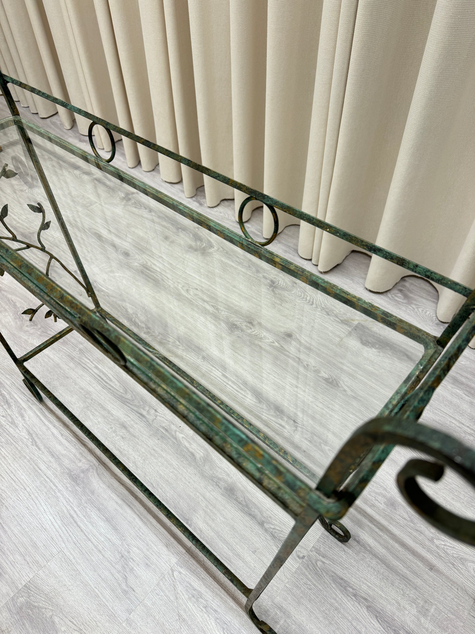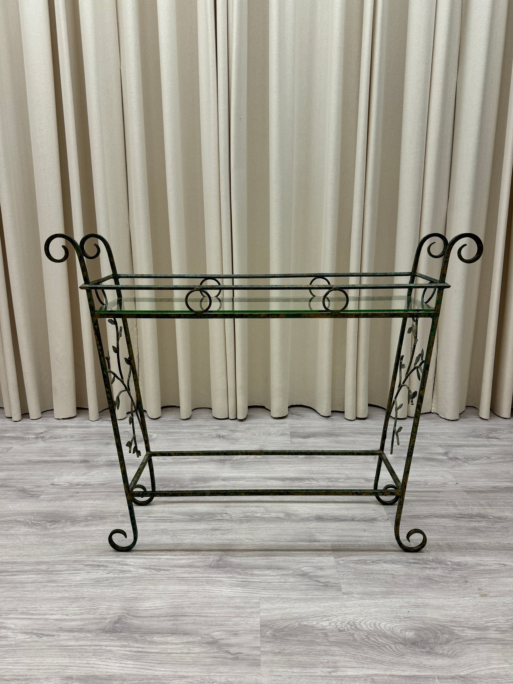 Mått: Längd ca 95 cm - Djup ca 25 cm - Höjd ca 75 cm. Slitage på glasdel. Nagg och repor. Enbart glas på överdel. Går i grön/blåa toner.