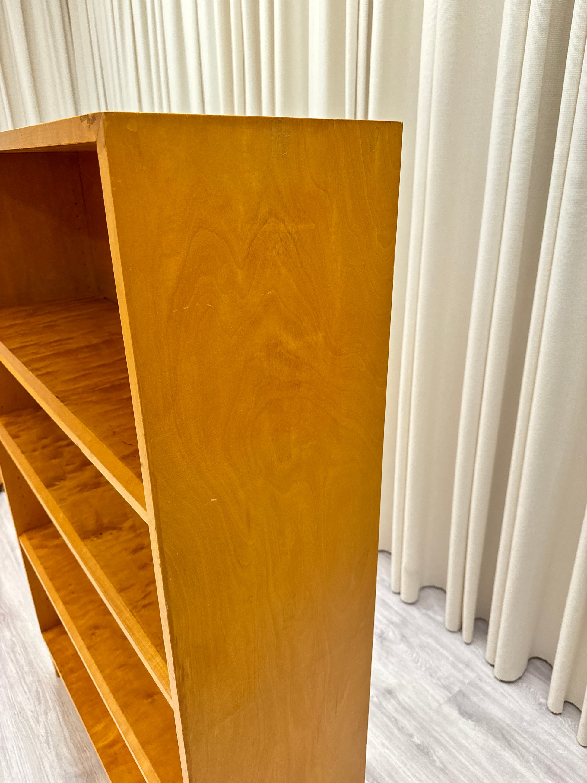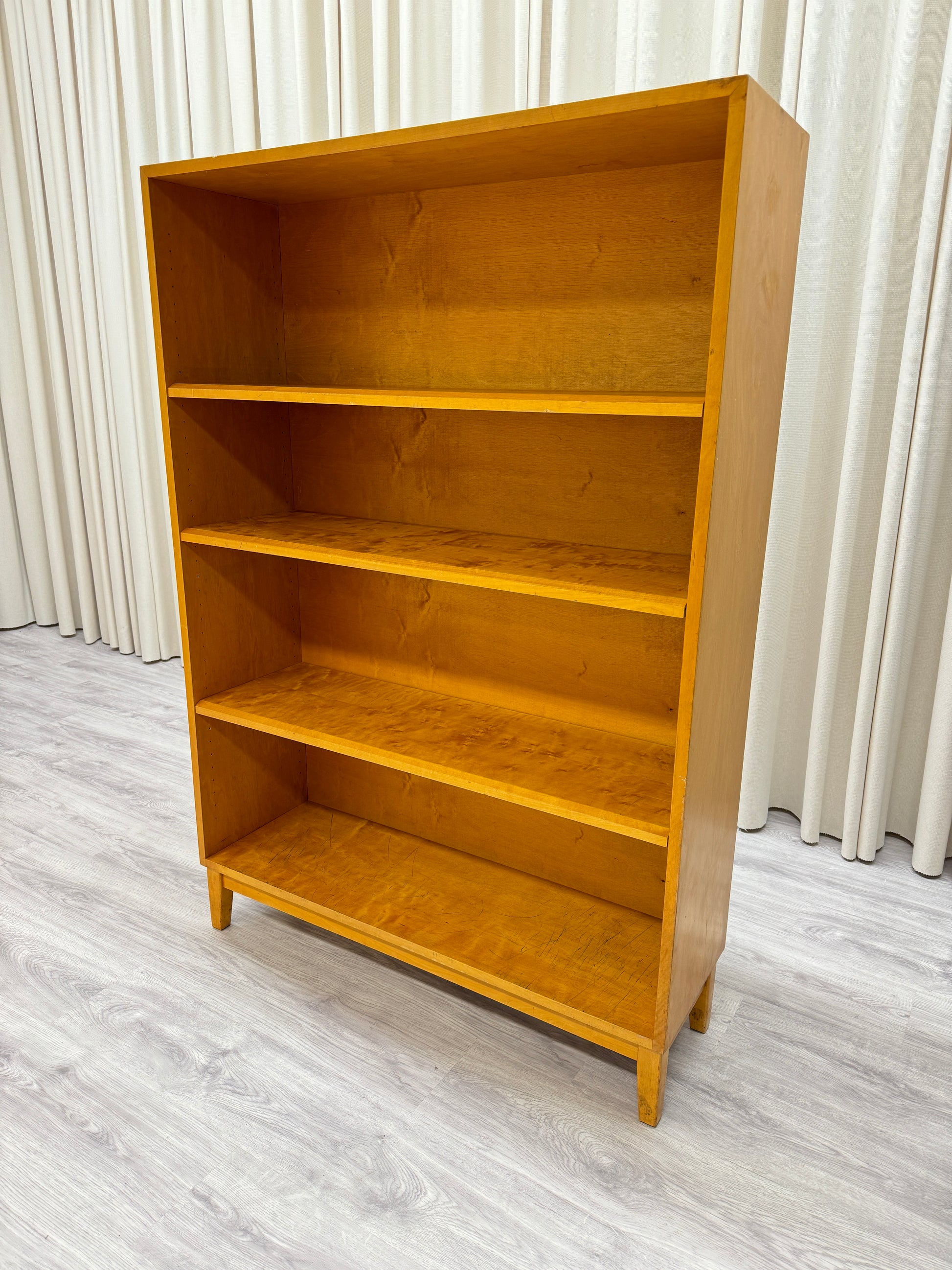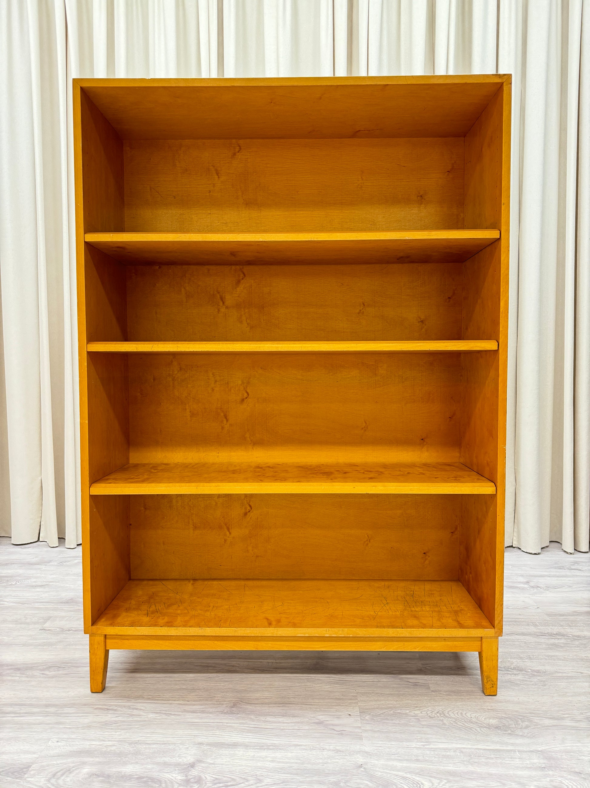 En klassisk bokhylla ifrån 1900-talets mitt. Fyra hyllplan. Nedre hyllplan kommer med slitage. Repor. Se foton. Mått: Höjd 145 cm - djup 31 cm - bredd 100 cm.,
