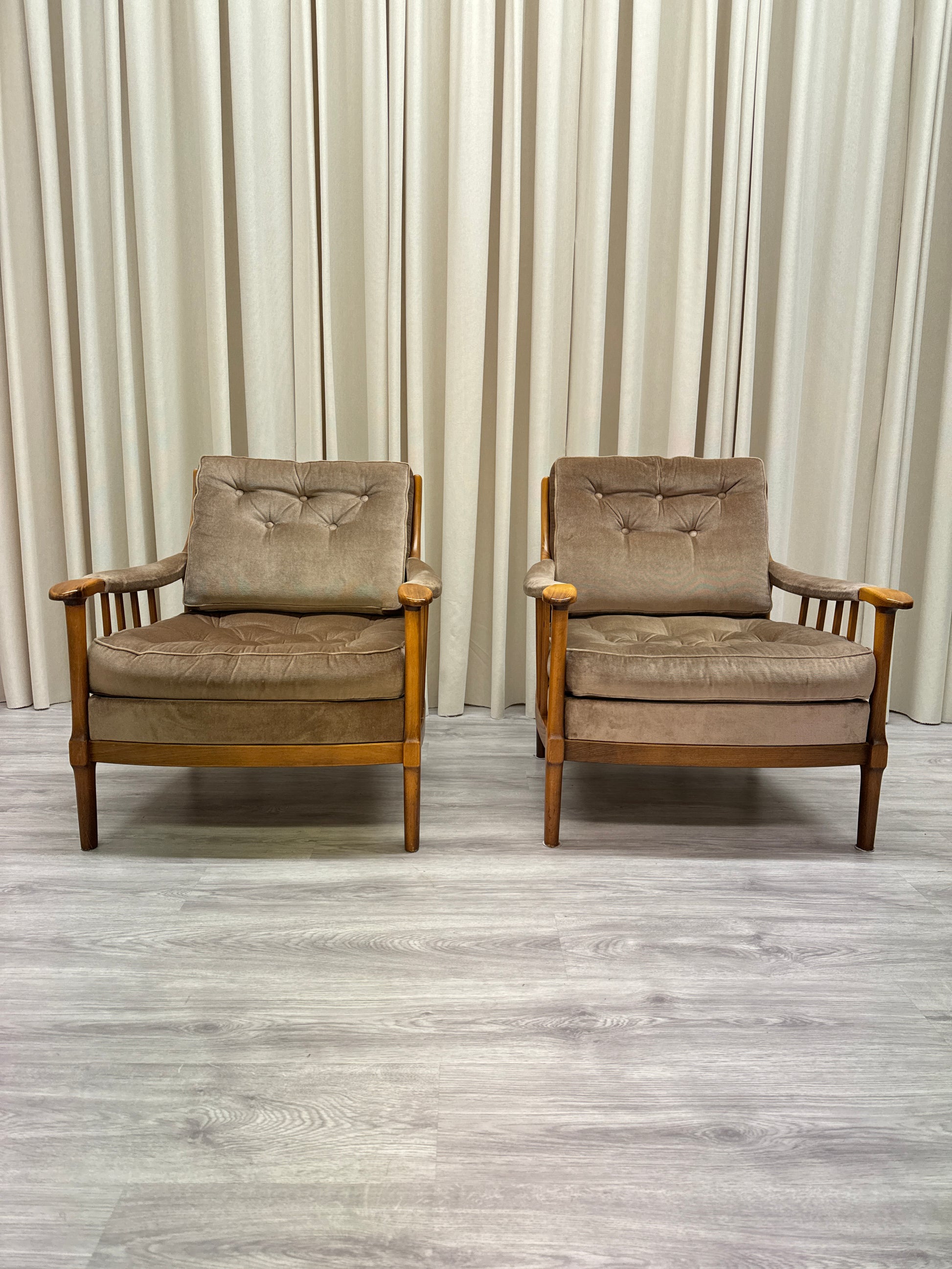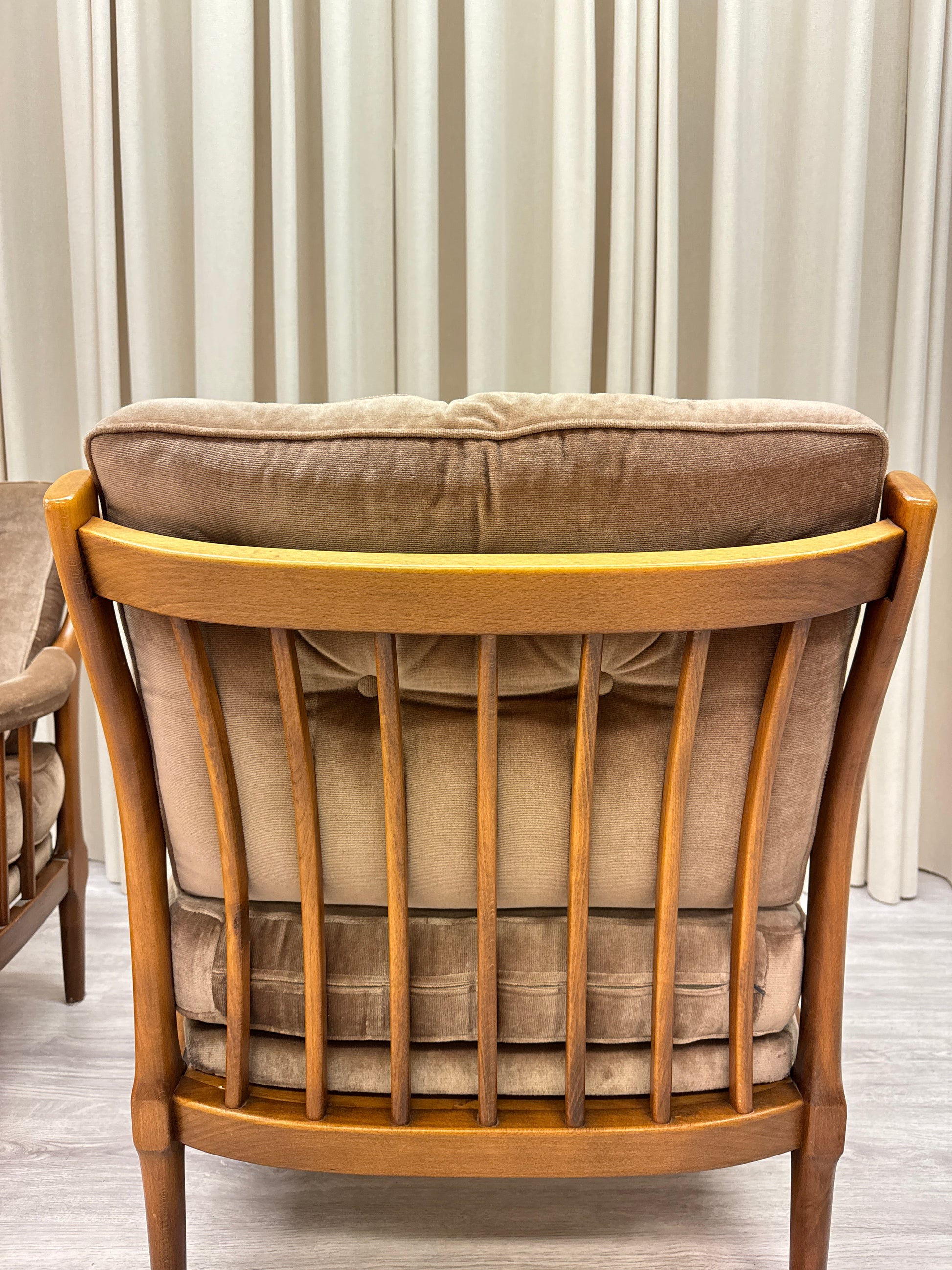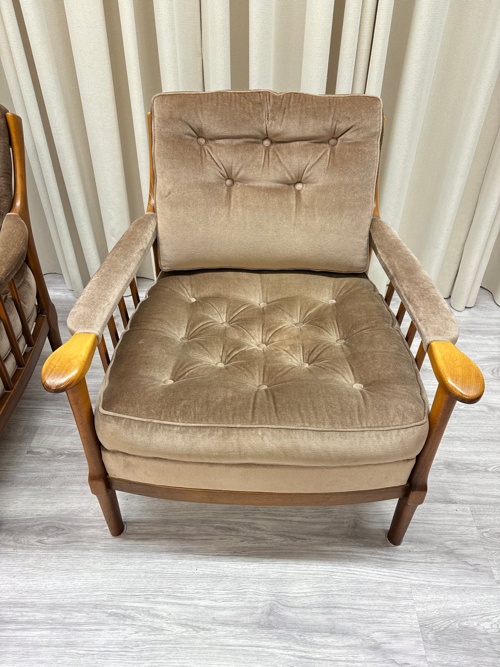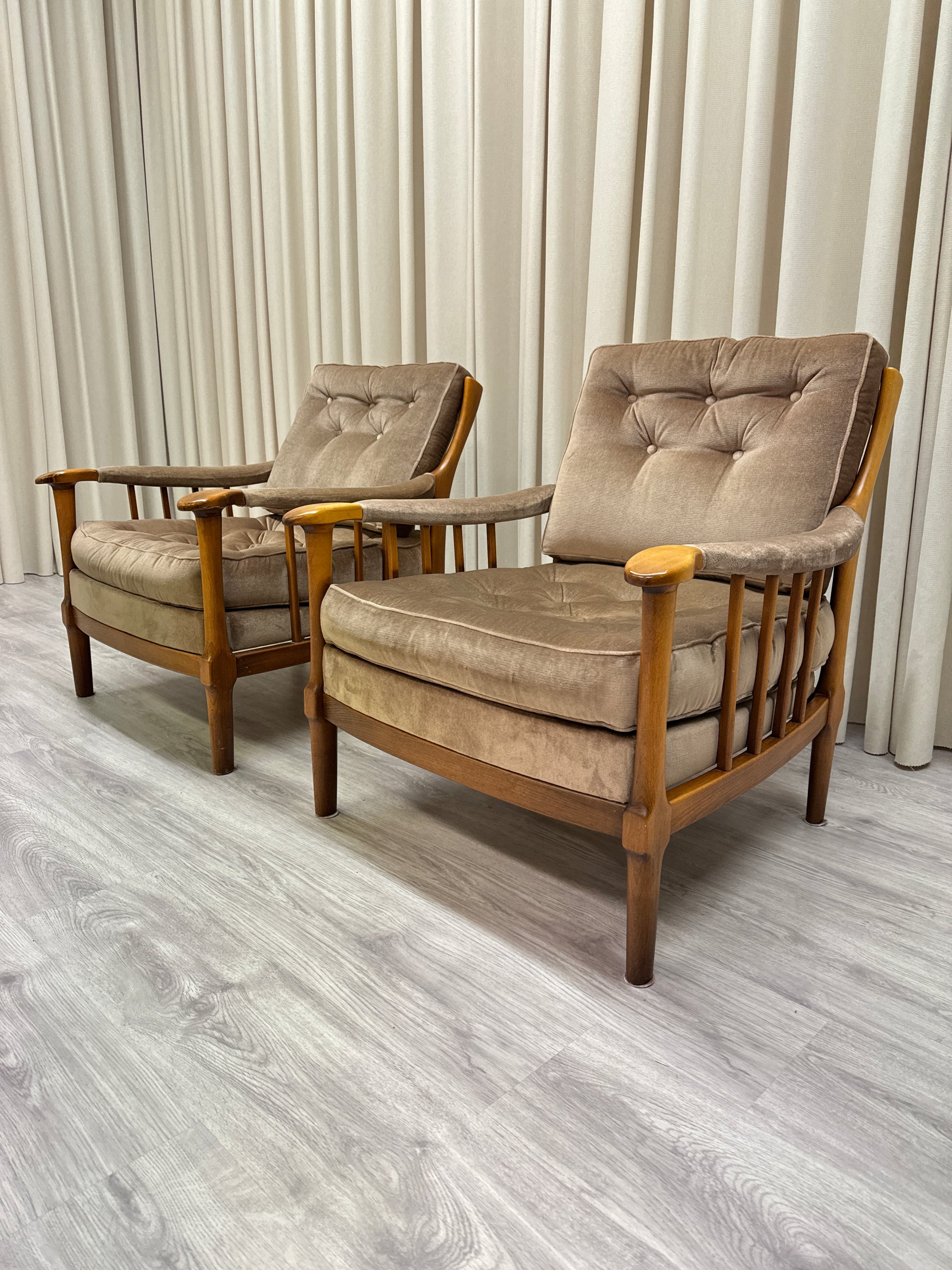 Två fåtöljer med sammetsrosa sits. Notering kring armstöd, i övrigt gott bruksskick. Säljes i par. Pris 1200:-/paret