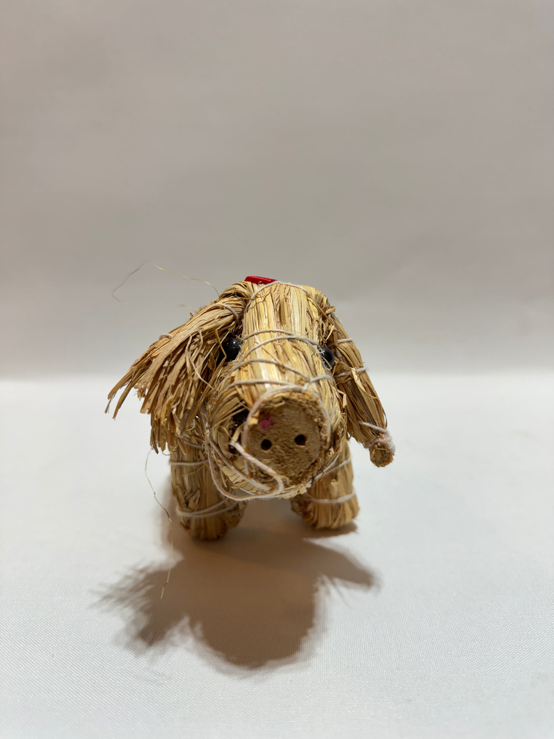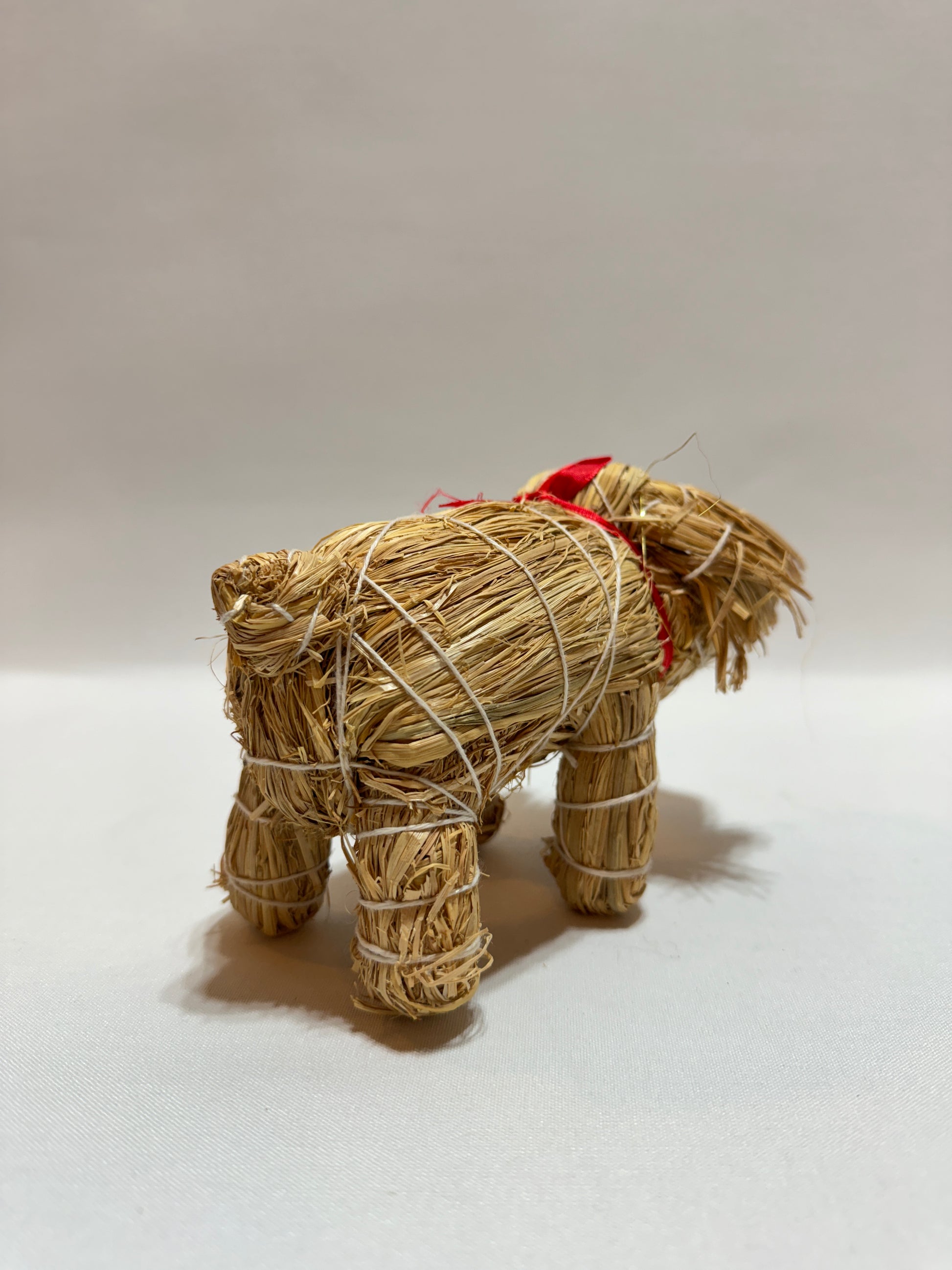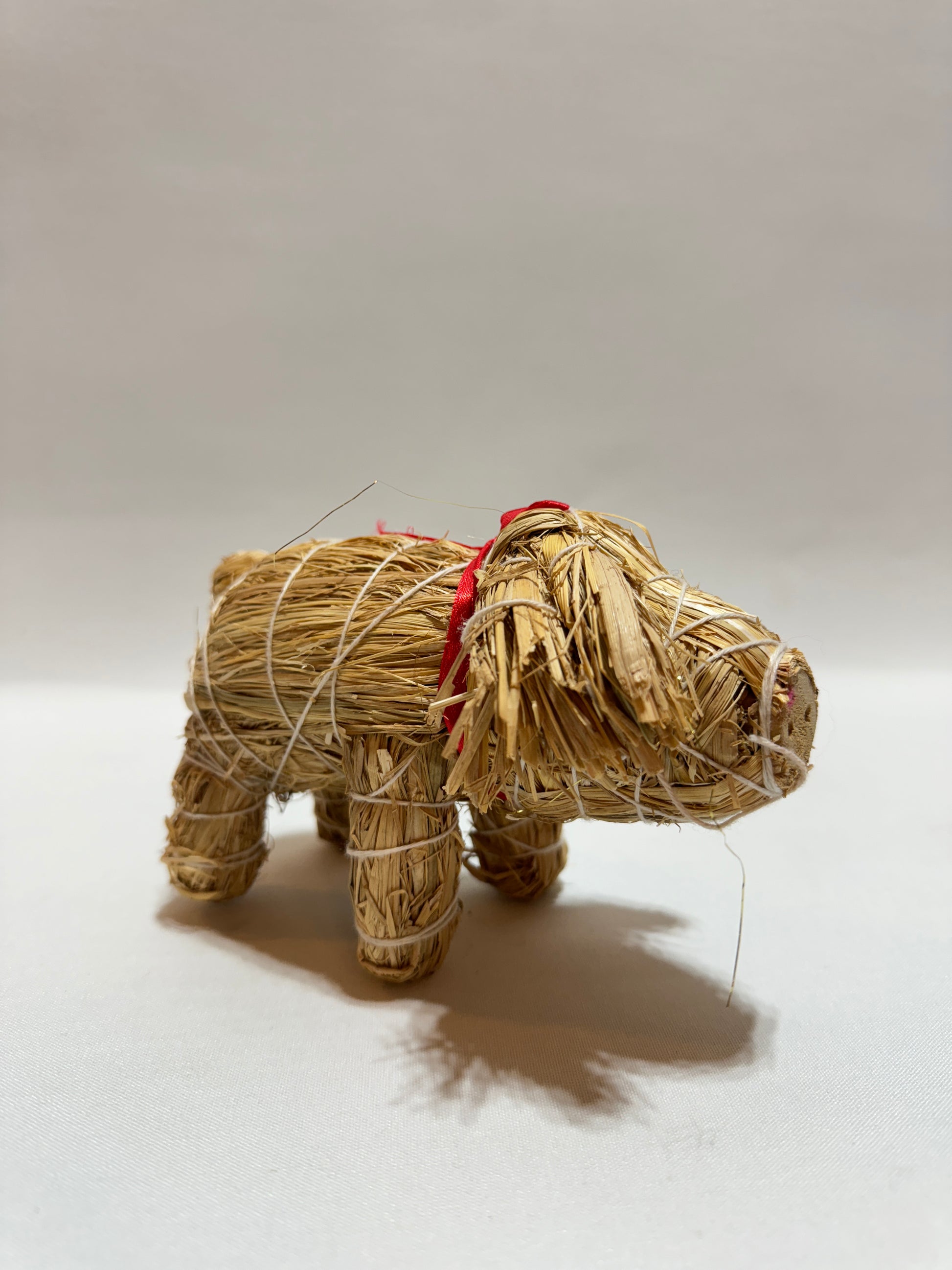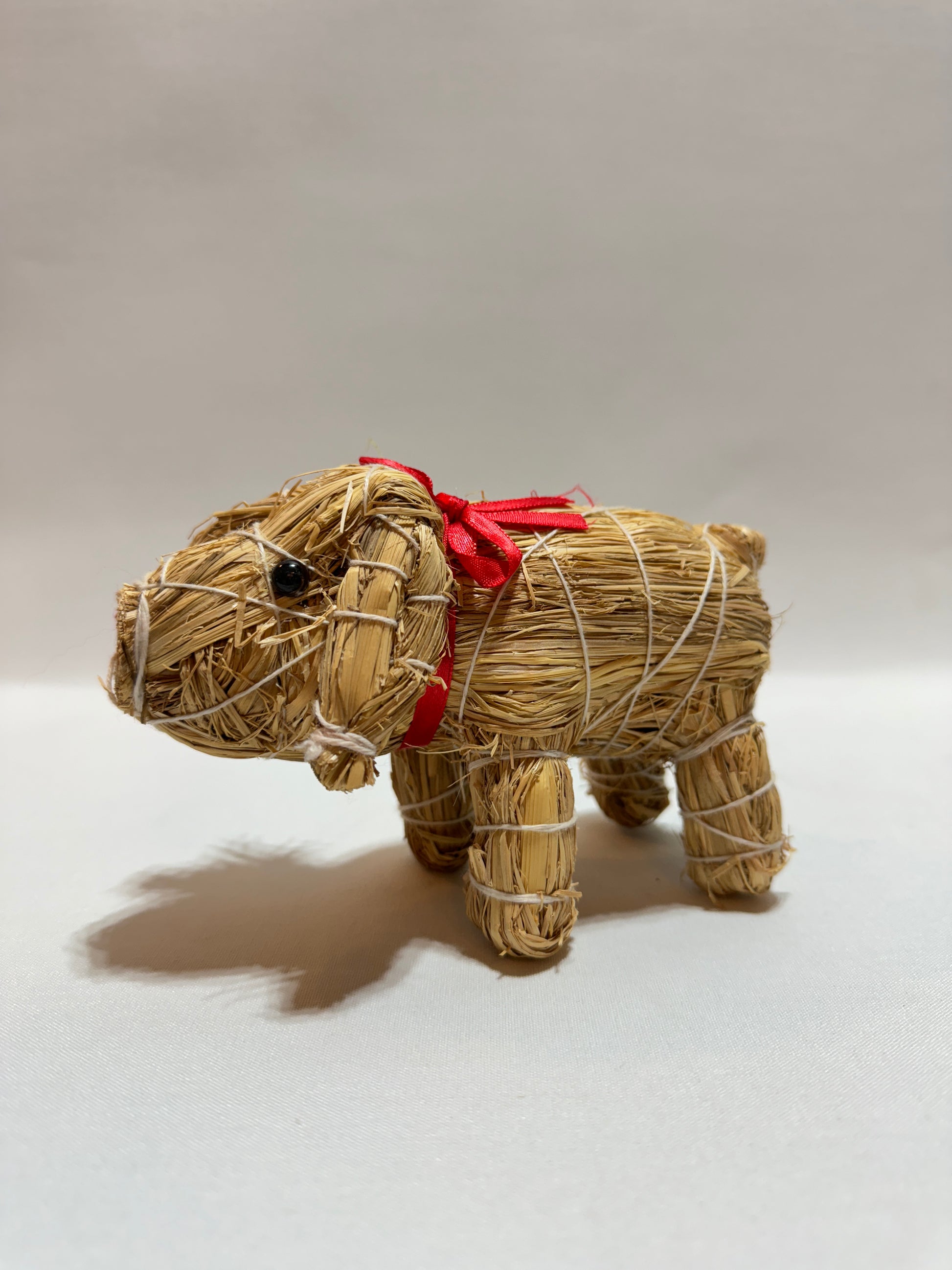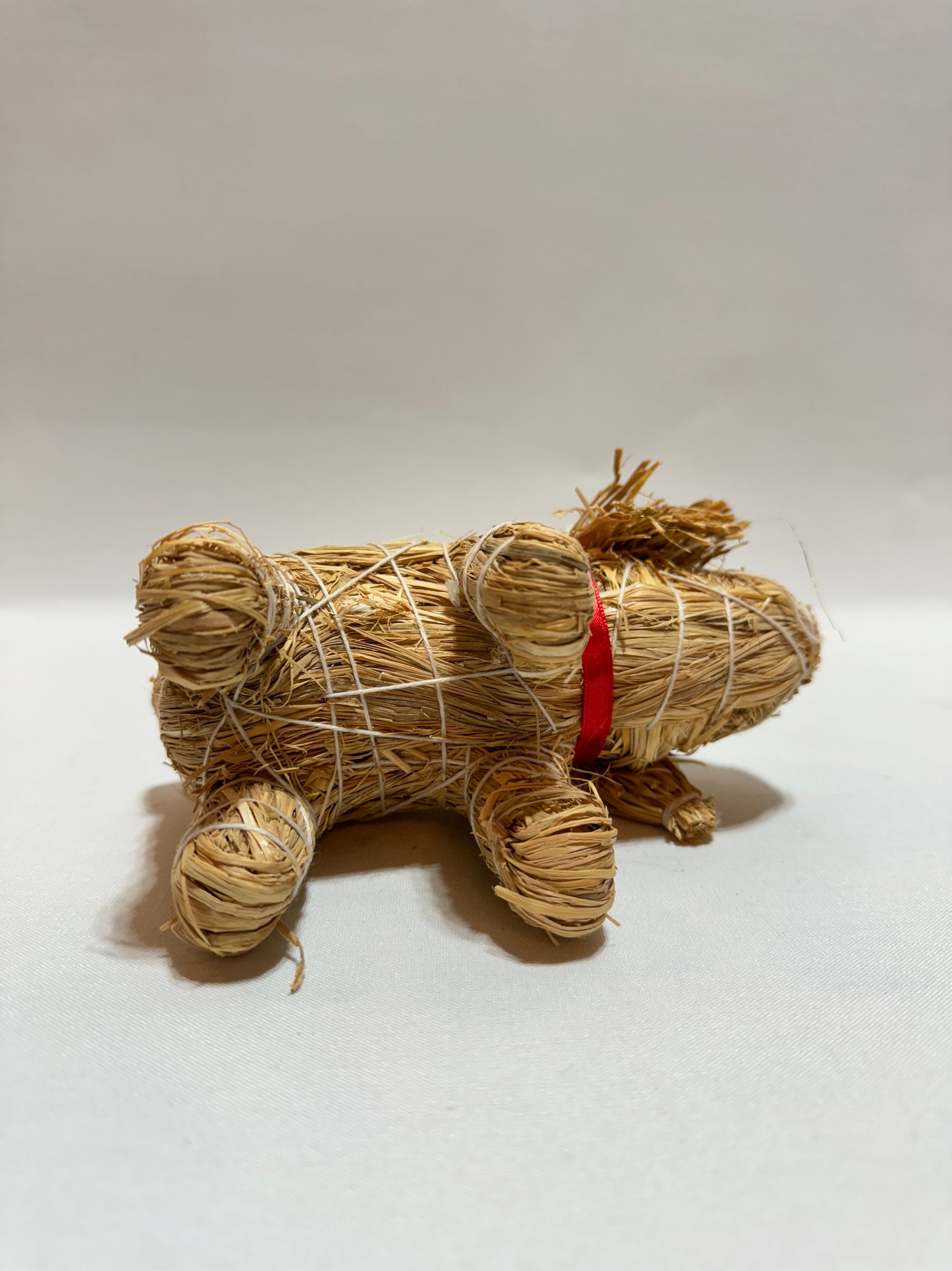 Liten halmgris som mäter ca 17 x 10 cm. Ena örat har lossnat. Se foton.