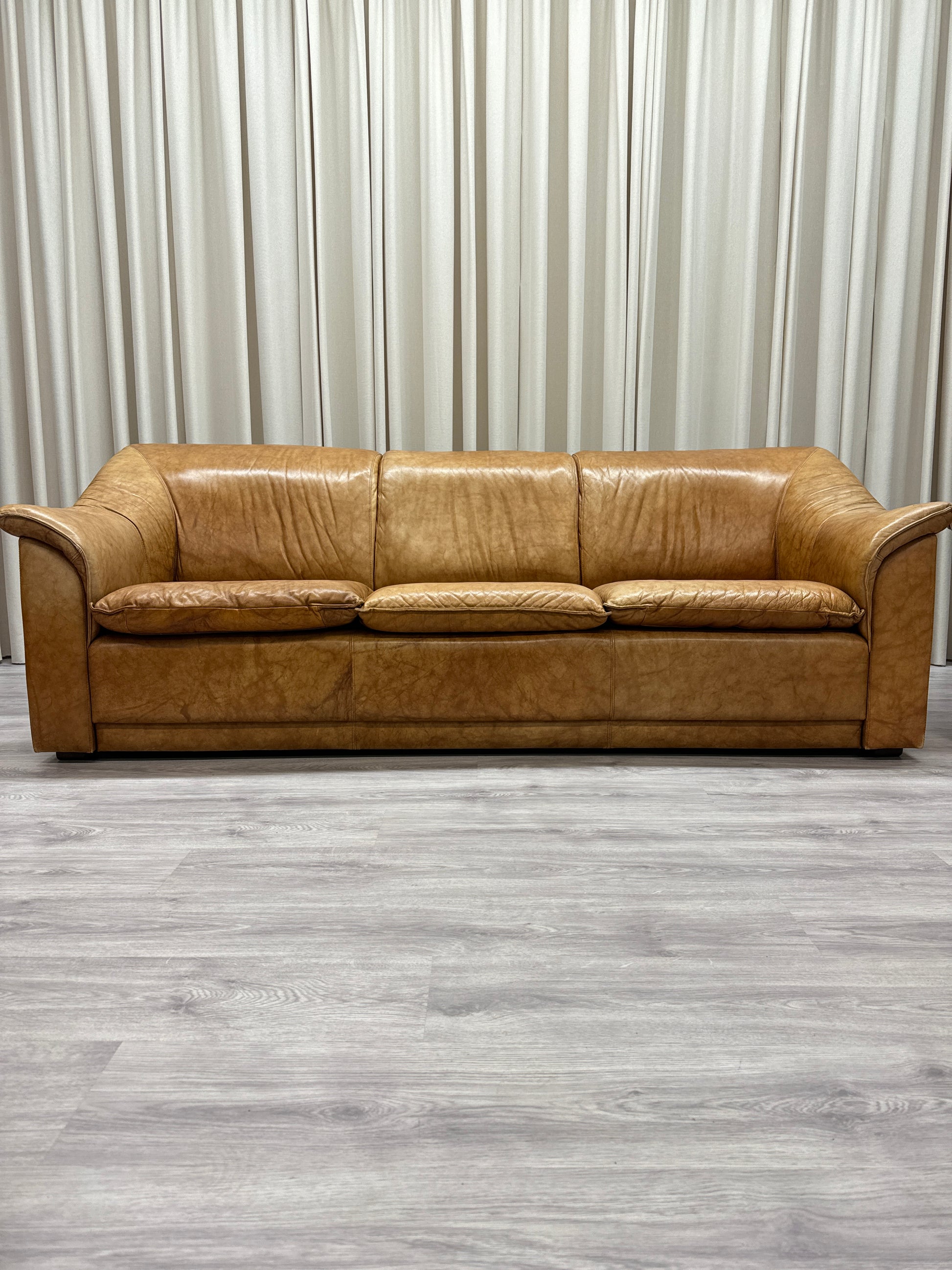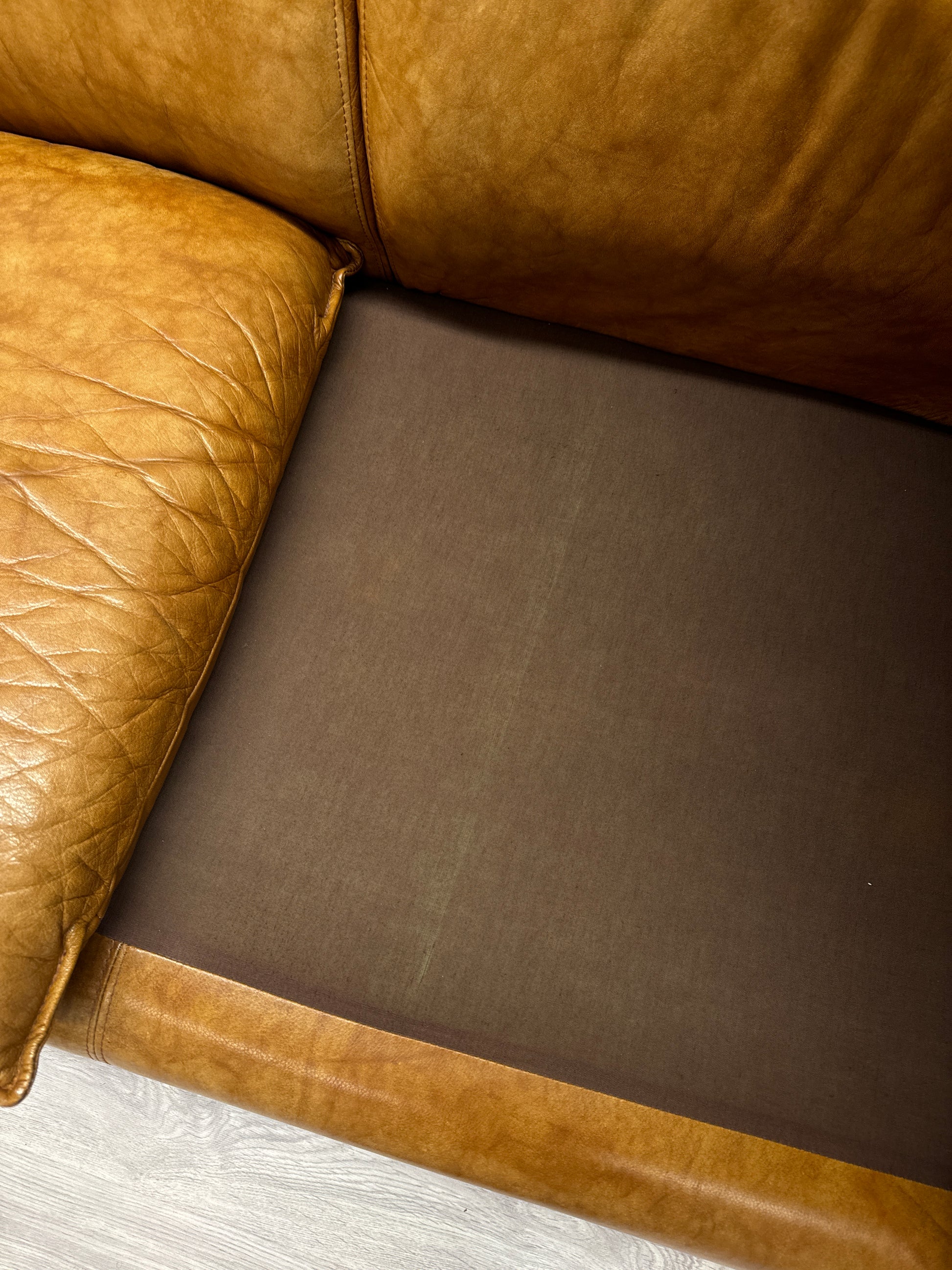 Kan endast hämtas ut i fysisk butik på Södra Kungsgatan 59 i Gävle. Inköpt under 1980-talet. Endast varit i ett hem sedan inköp. Italienskt skinn. Kommer i en ljusbrun konjaksfärg. Mjuk. I gott bruksskick.