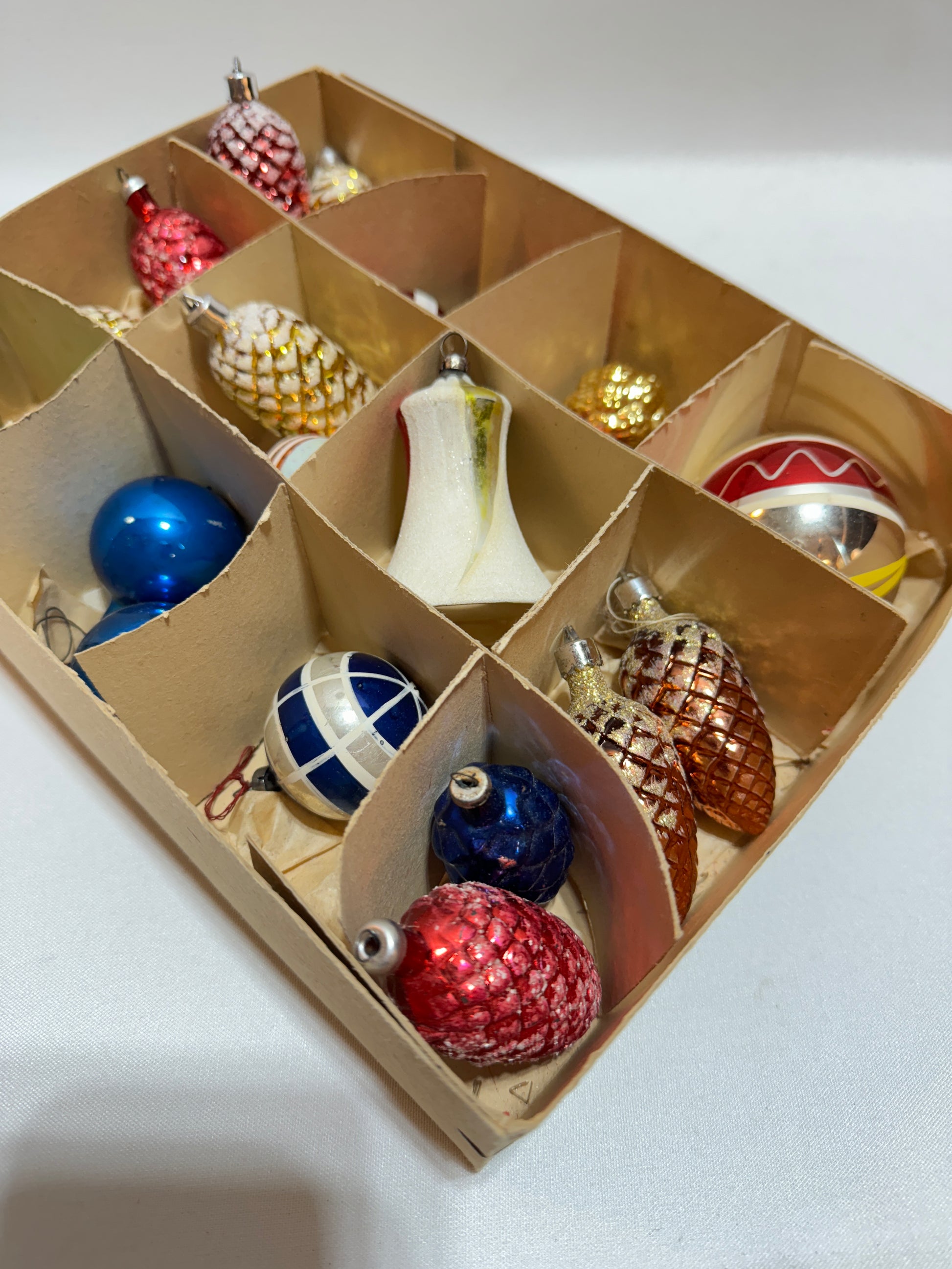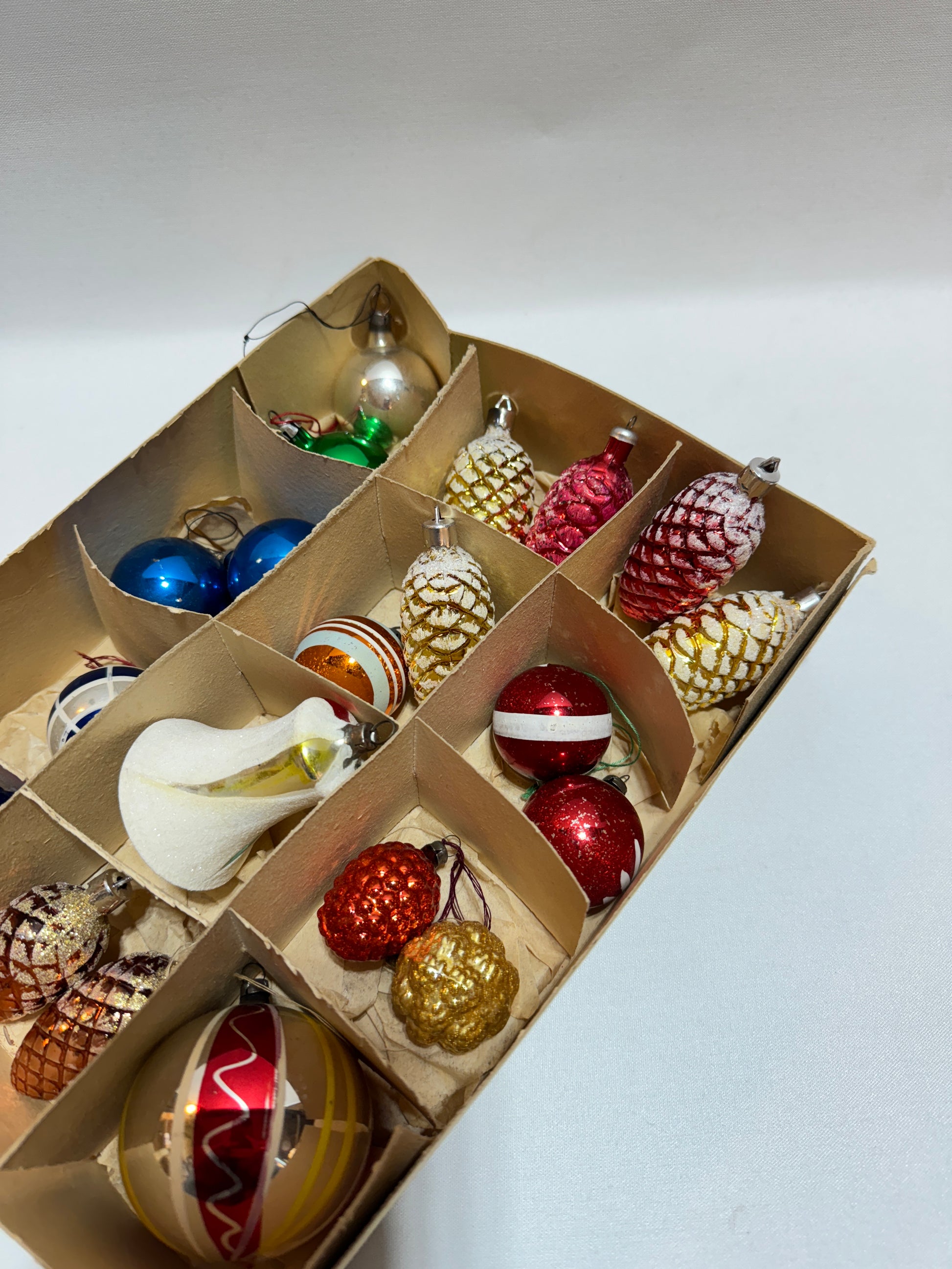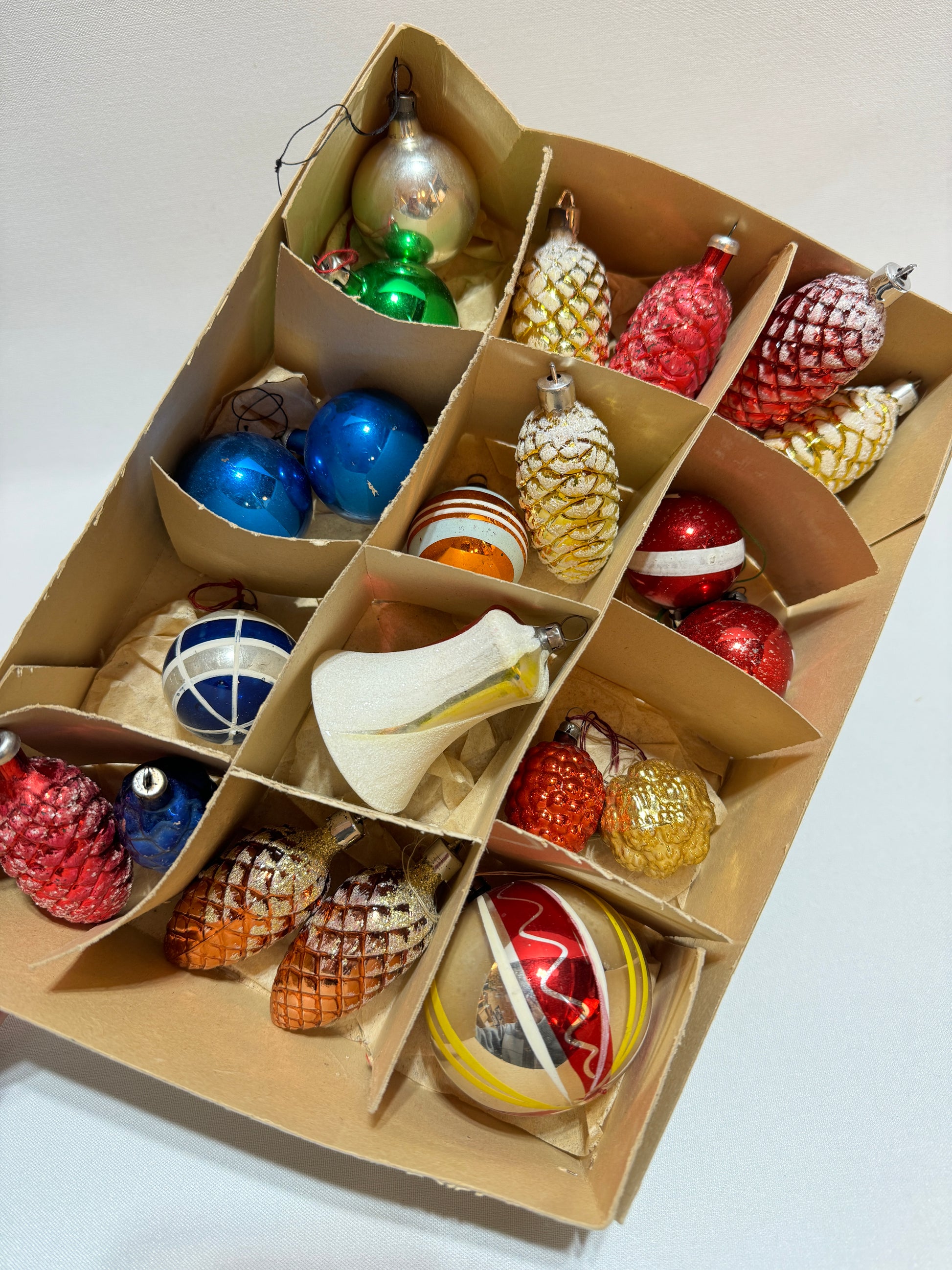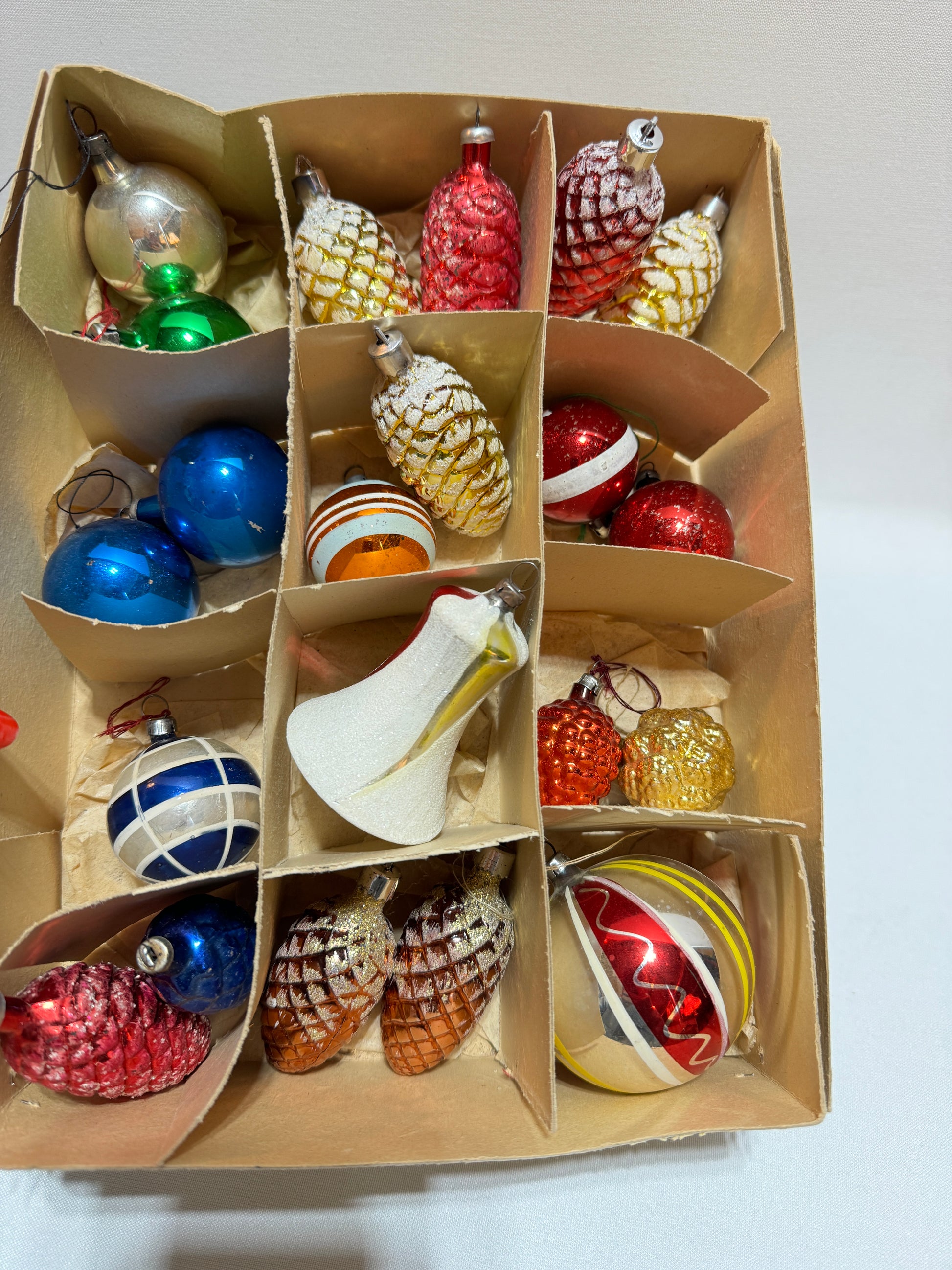 En kartong med 21 st julgranskulor i mått från 4 cm upp till 6 cm. Från tidiga 1900-tal.