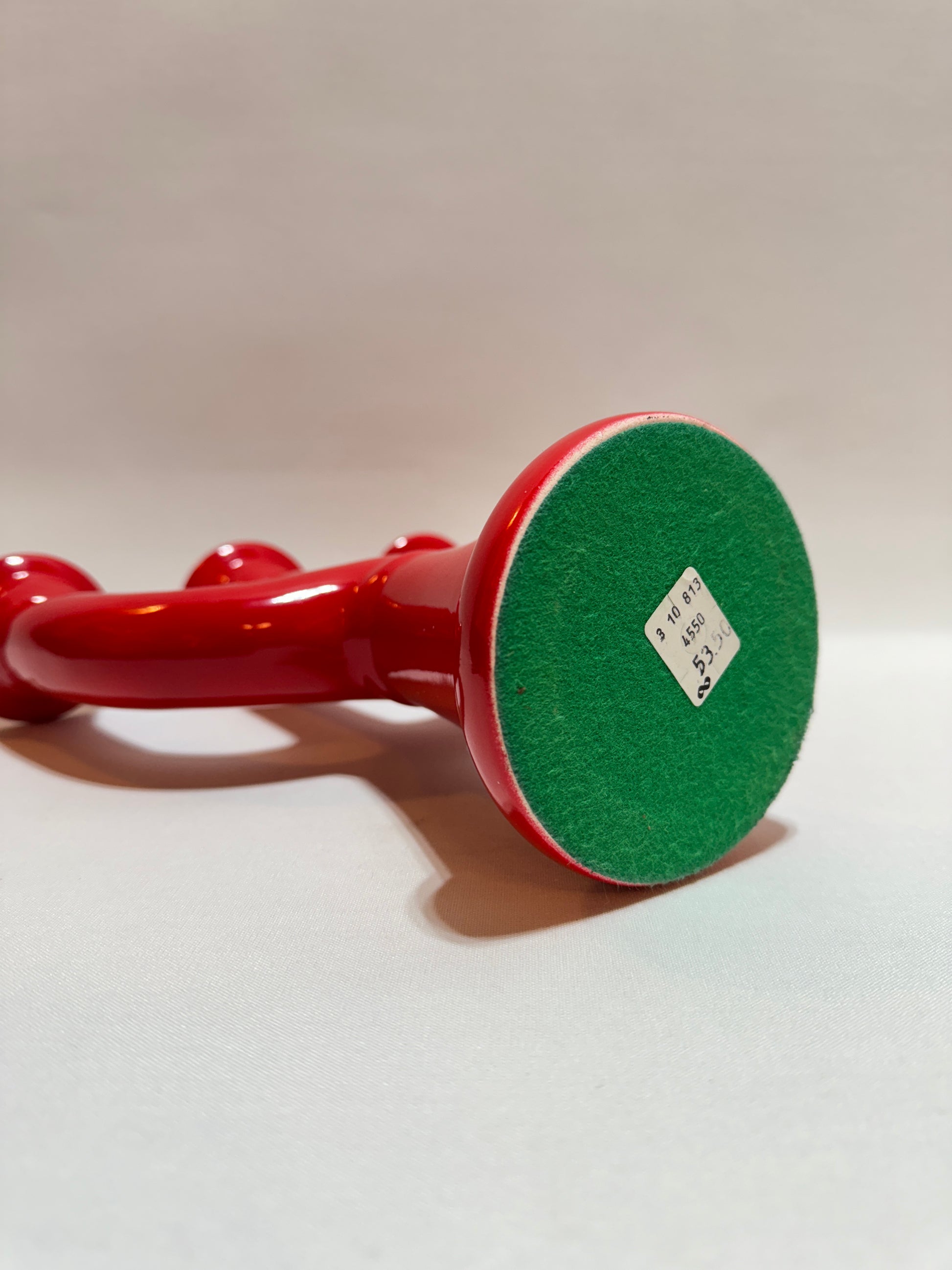 Ljusstaken är i porslin och är klarröd. Höjd 23 cm. I gott bruksskick!
