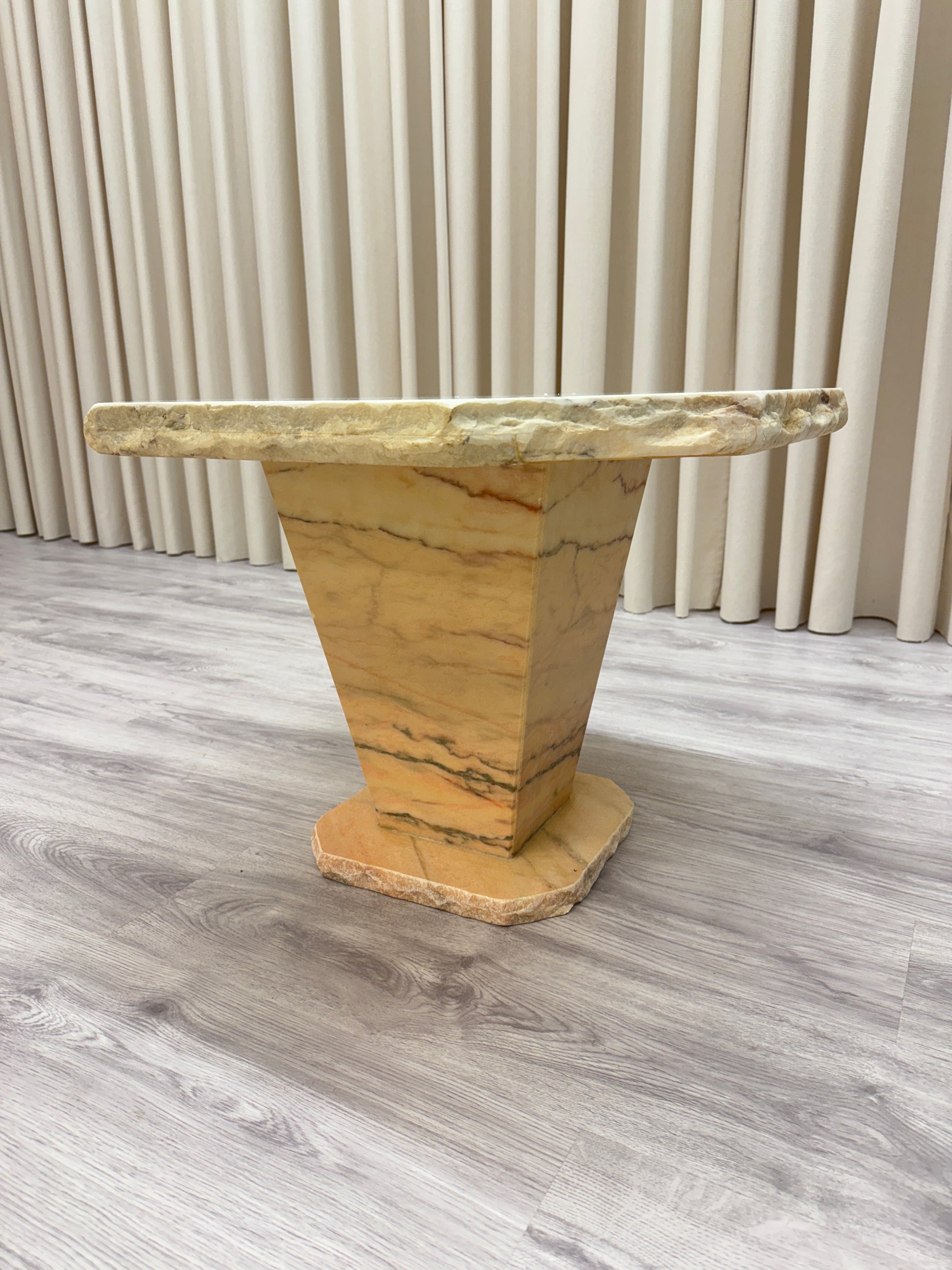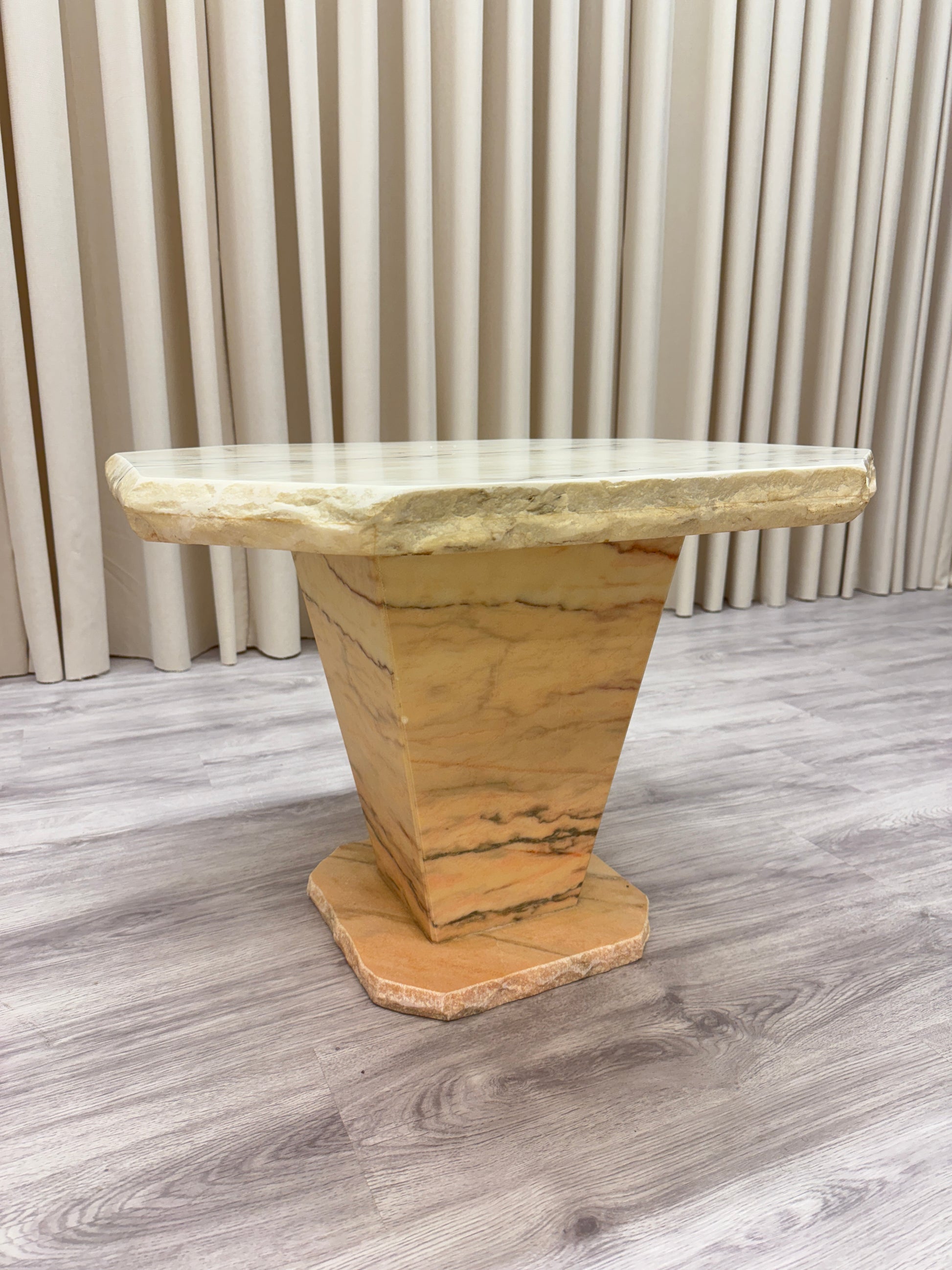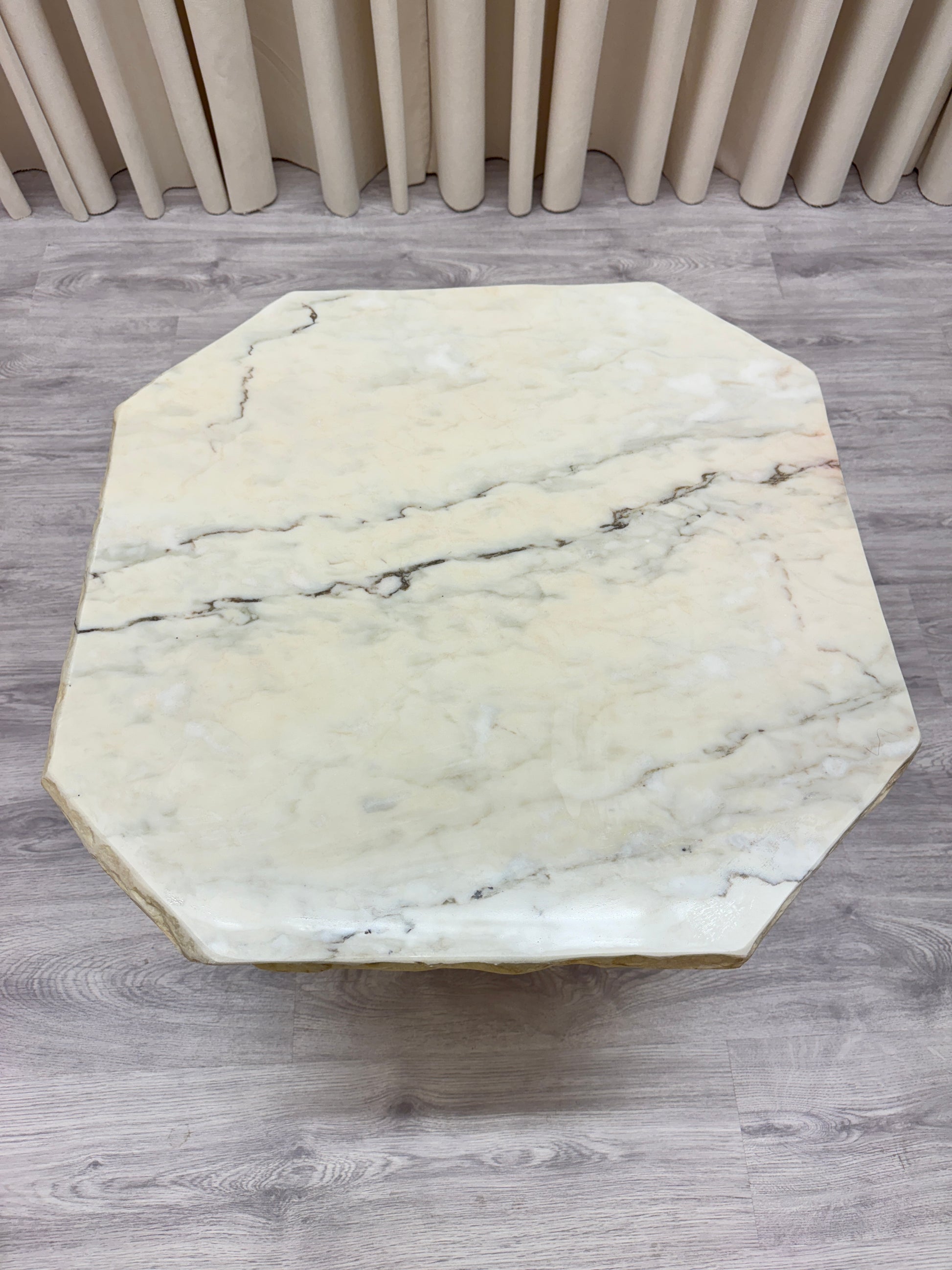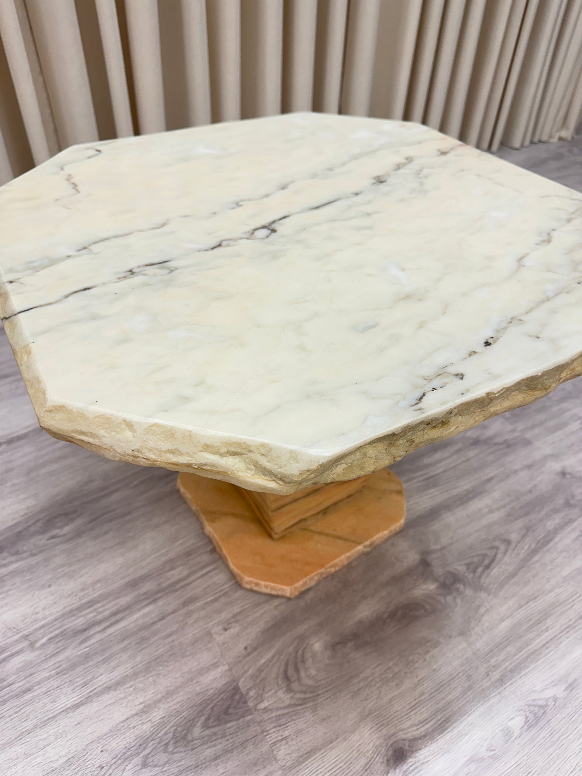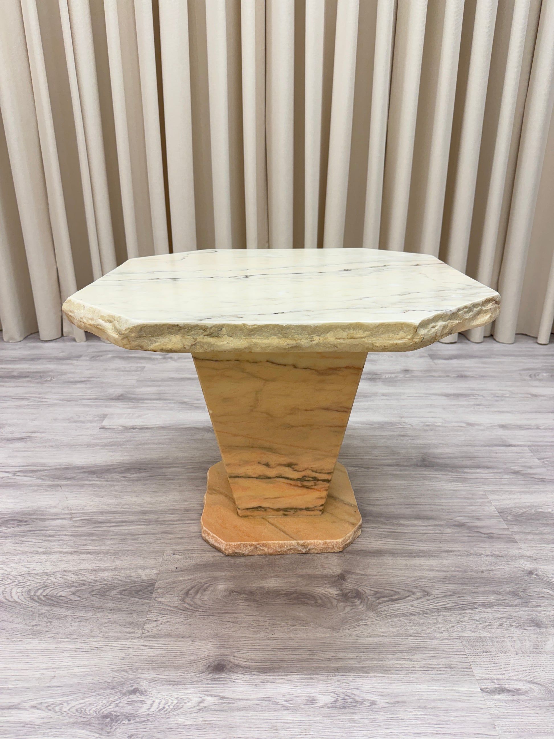 Marmorbordet väger ca 60 kg och går i vit/rosa toner. Bordet är i två delar. Någon repa, i övrigt gott bruksskick. Se närmare foton.