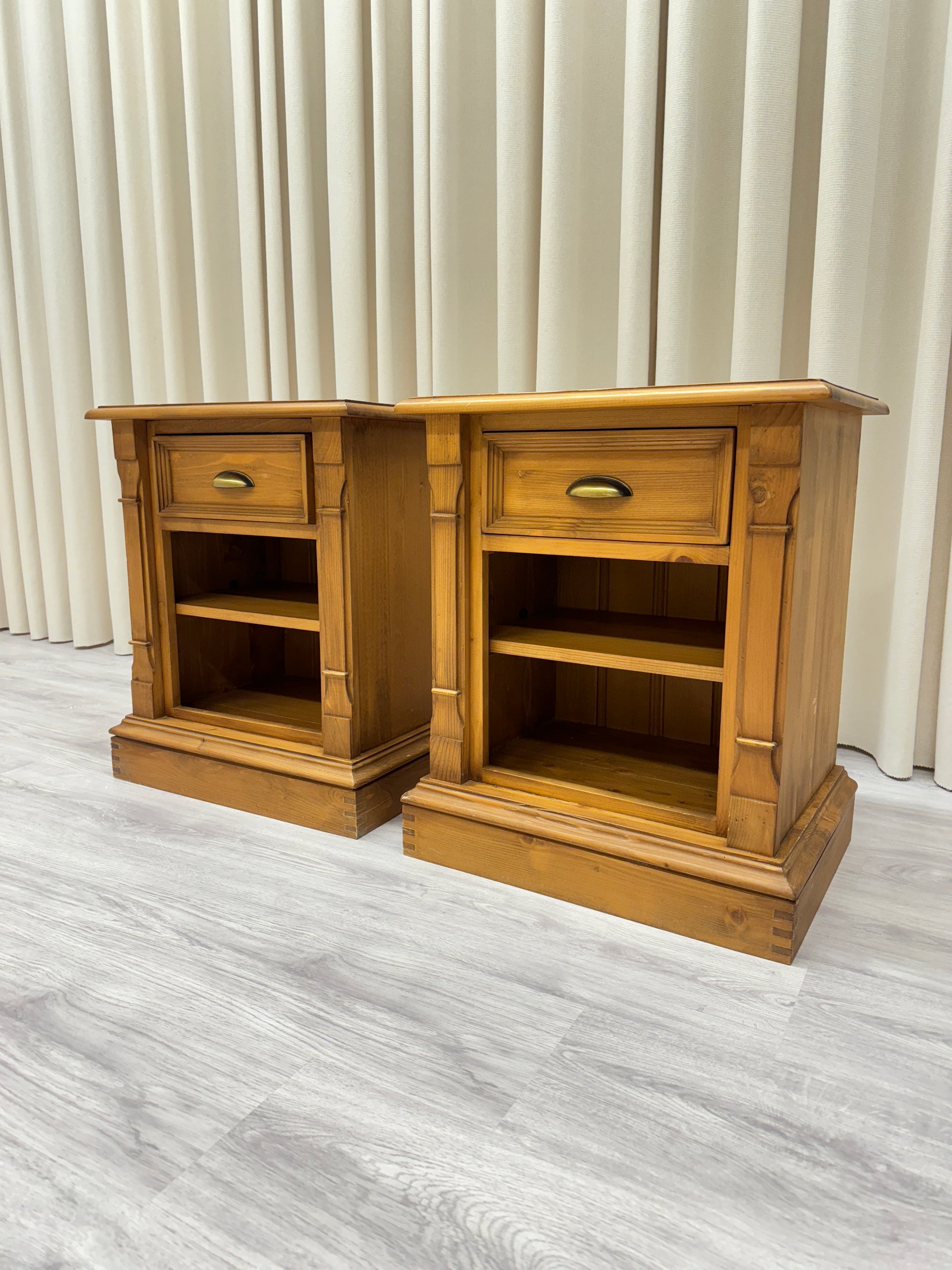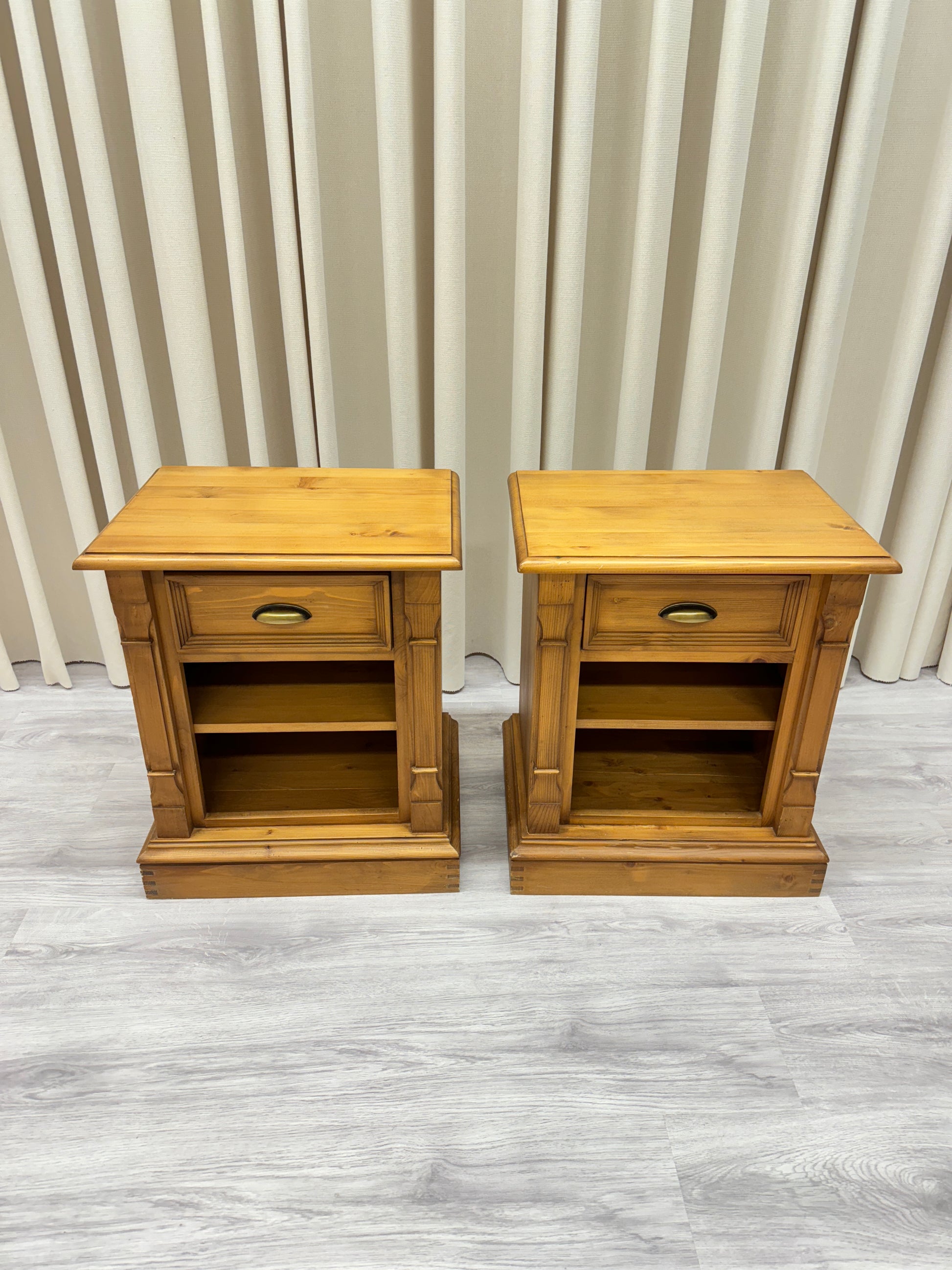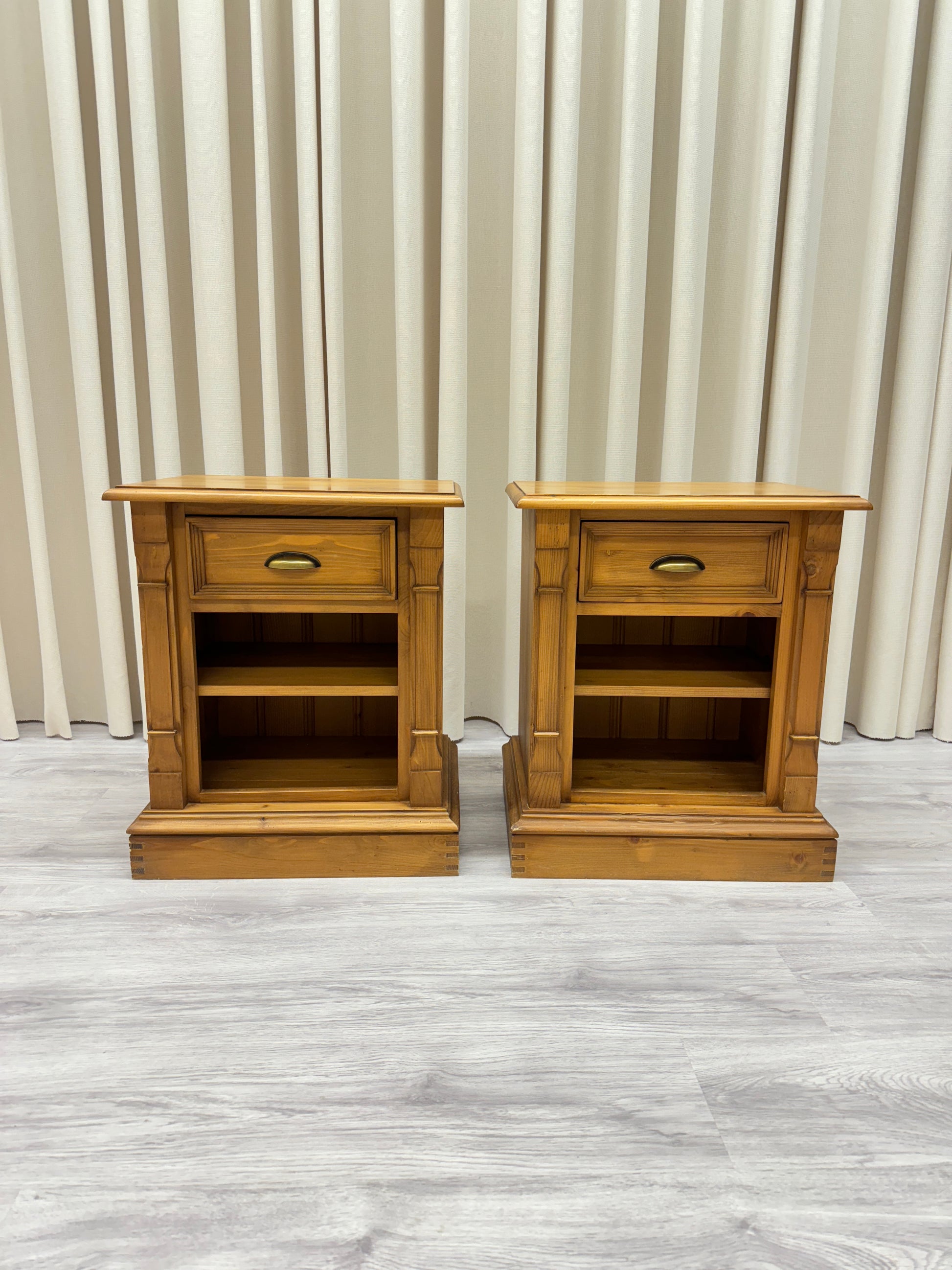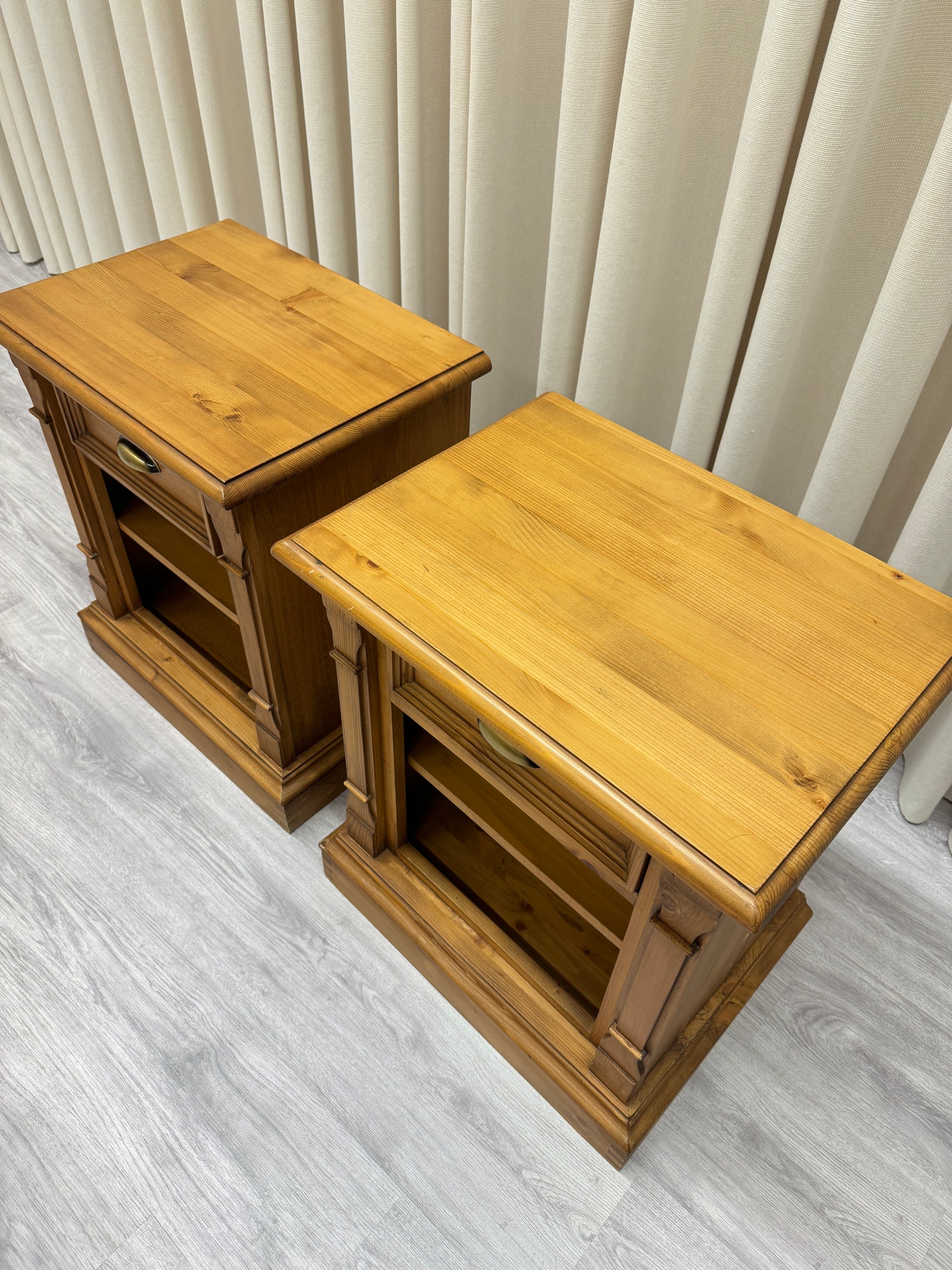 Nattduksborden från sena 80-talet kommer i massiv furu. I gott bruksskick. Säljes i par.