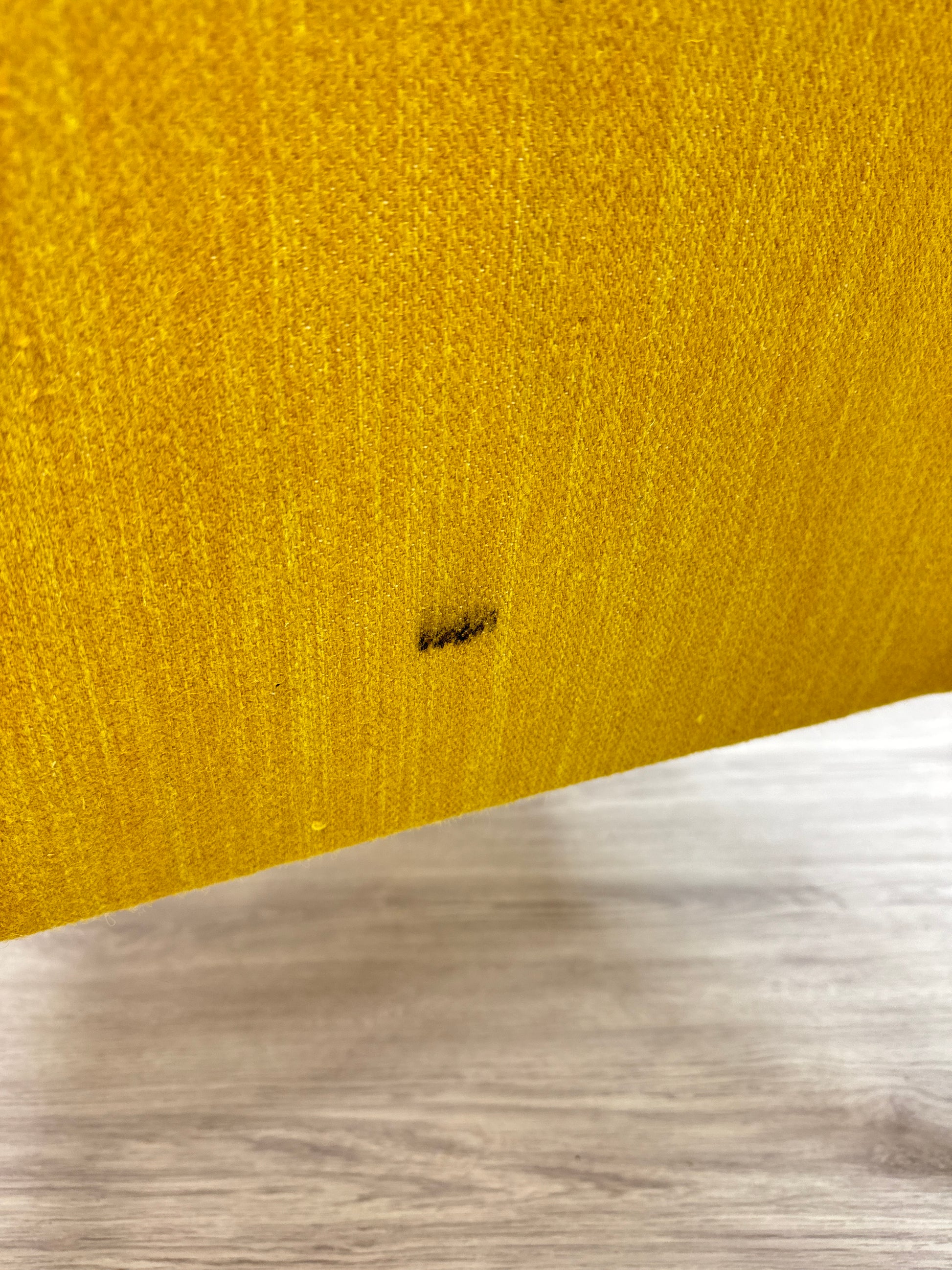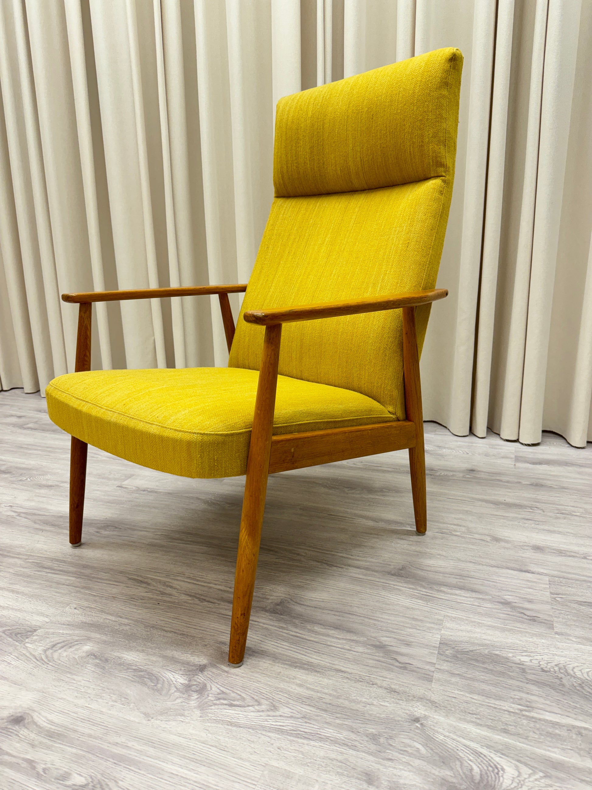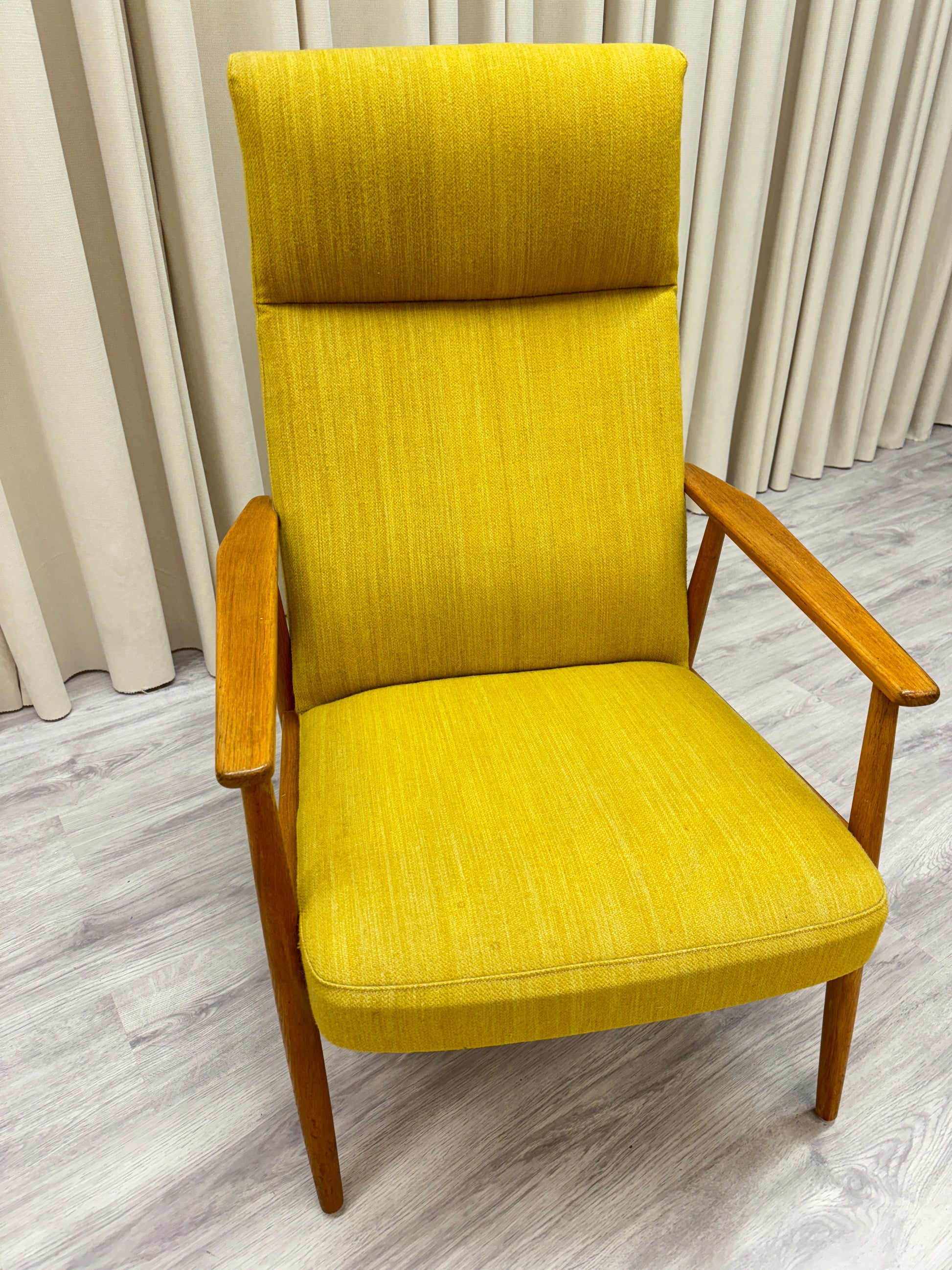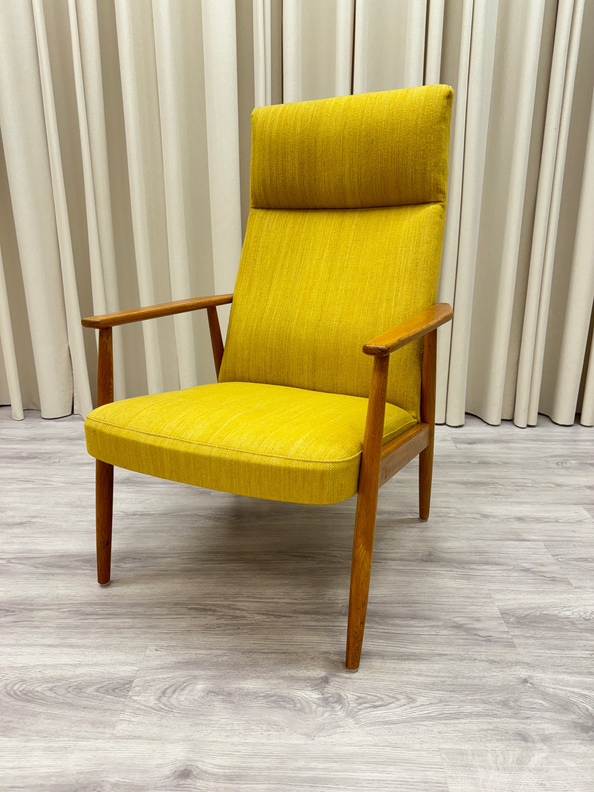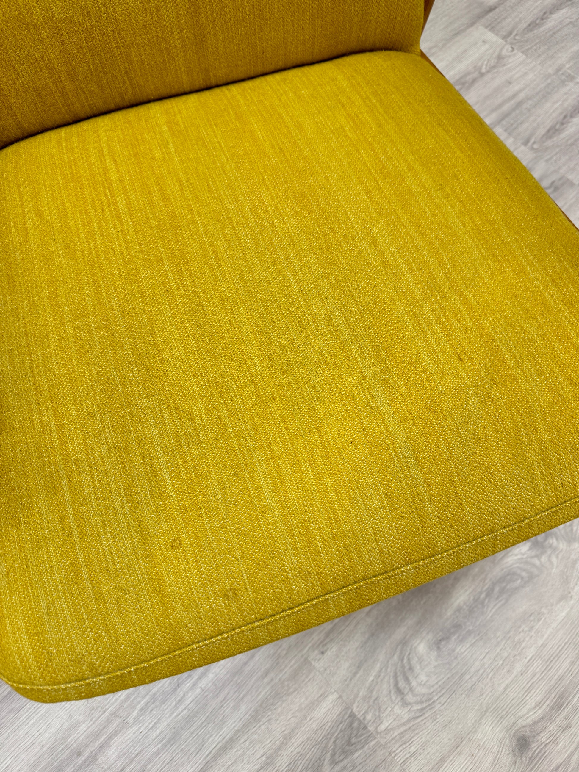 Kan endast hämtas ut i fysisk butik på Södra Kungsgatan 59 i Gävle. Mått: höjd 104 cm - sitthöjd 40 cm - bredd 66 cm - djup 70 cm. Senapsgul textil med ek. 1950/60-tal. Fläck på rygg, i övrigt gott bruksskick. Se foton.