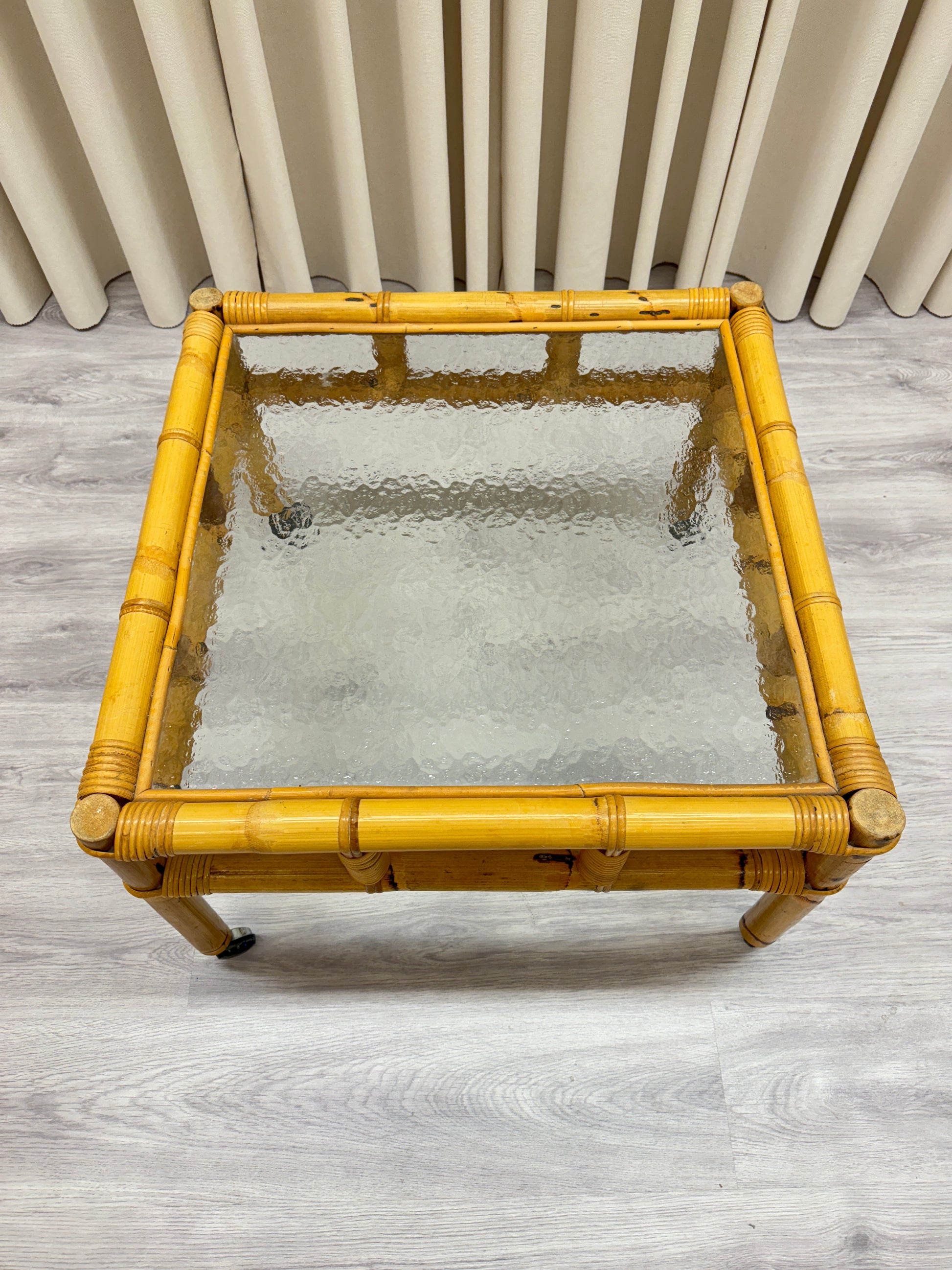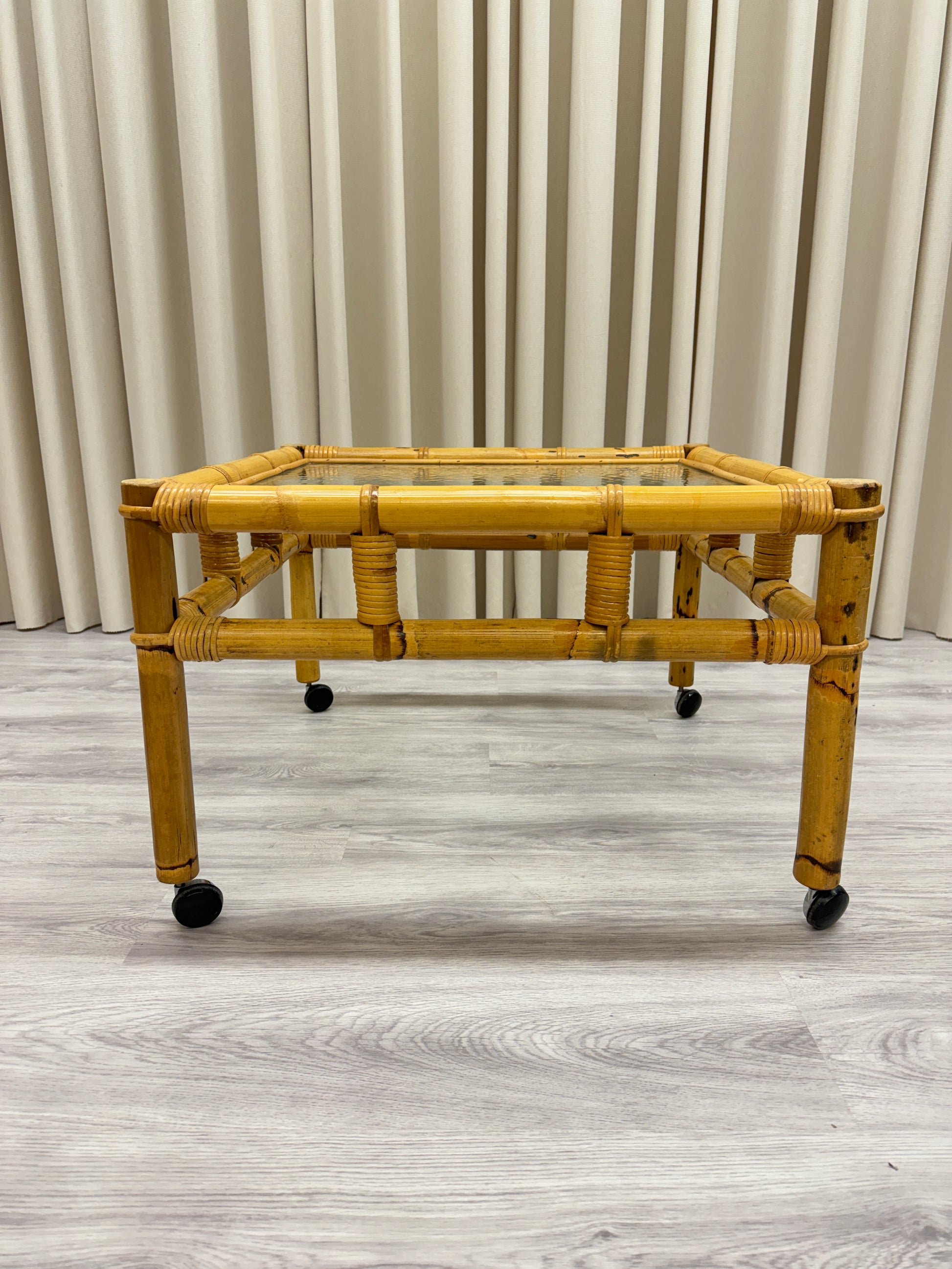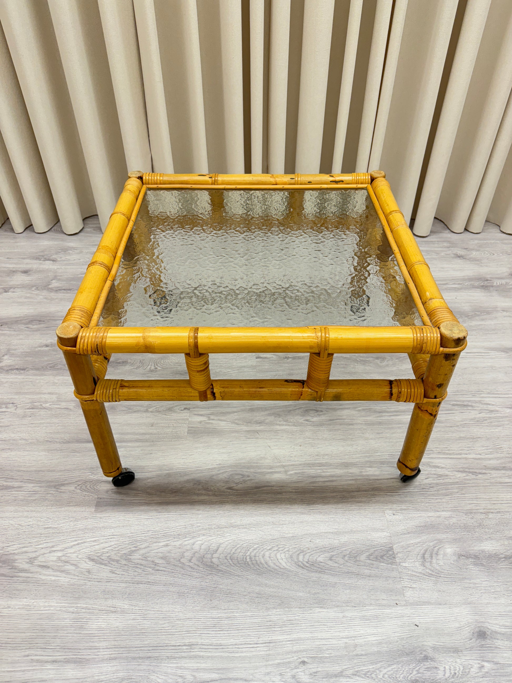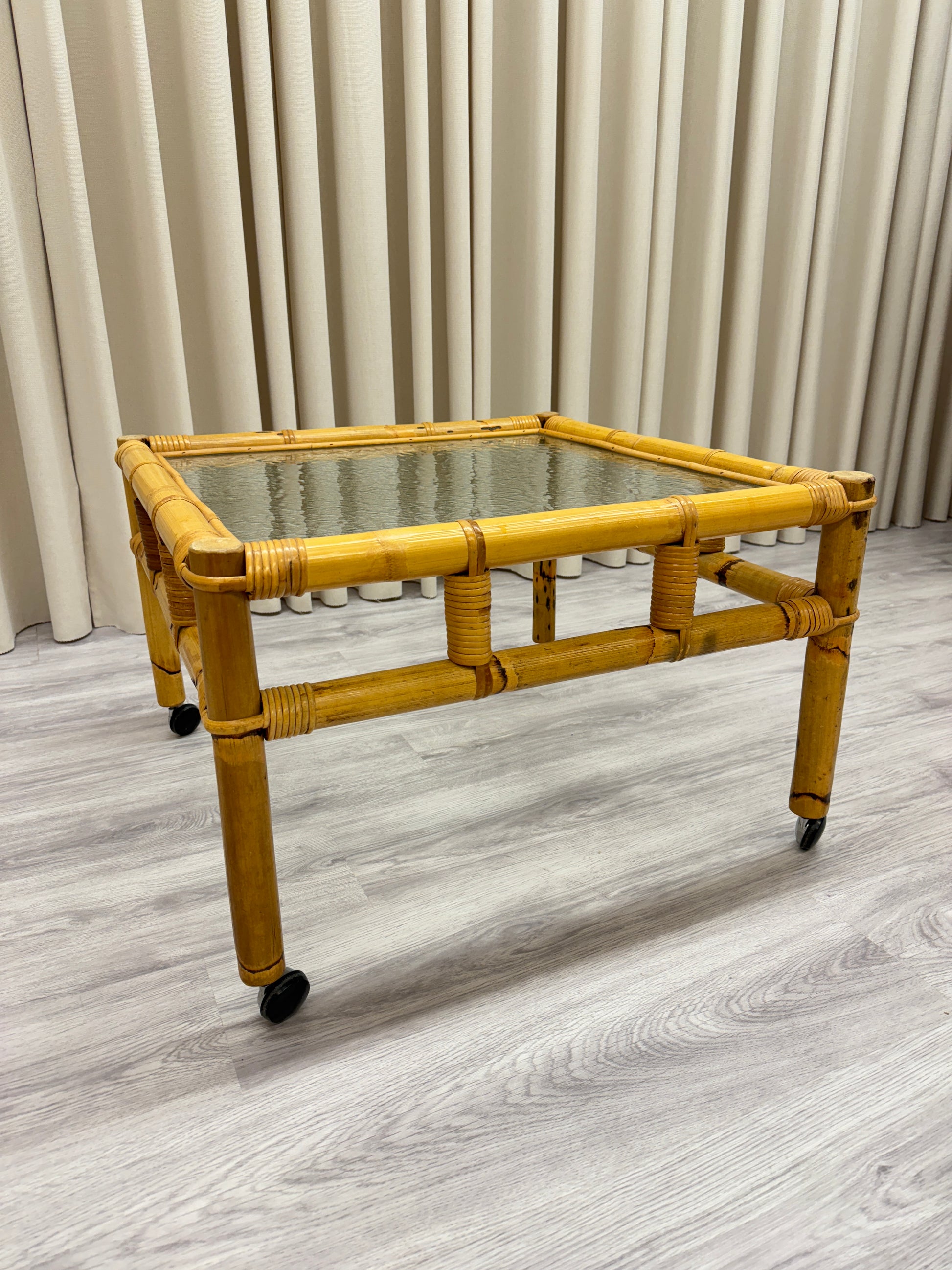 Fyrkantigt rottingbord med hjul. I gott bruksskick!
