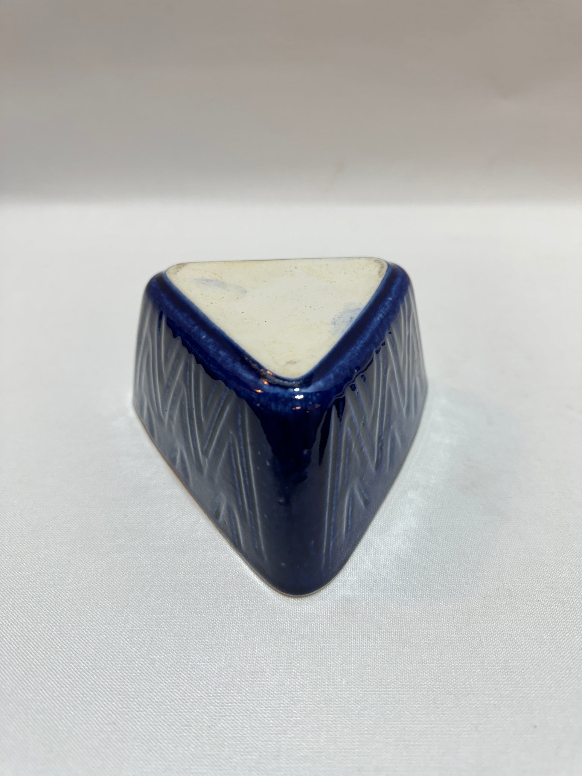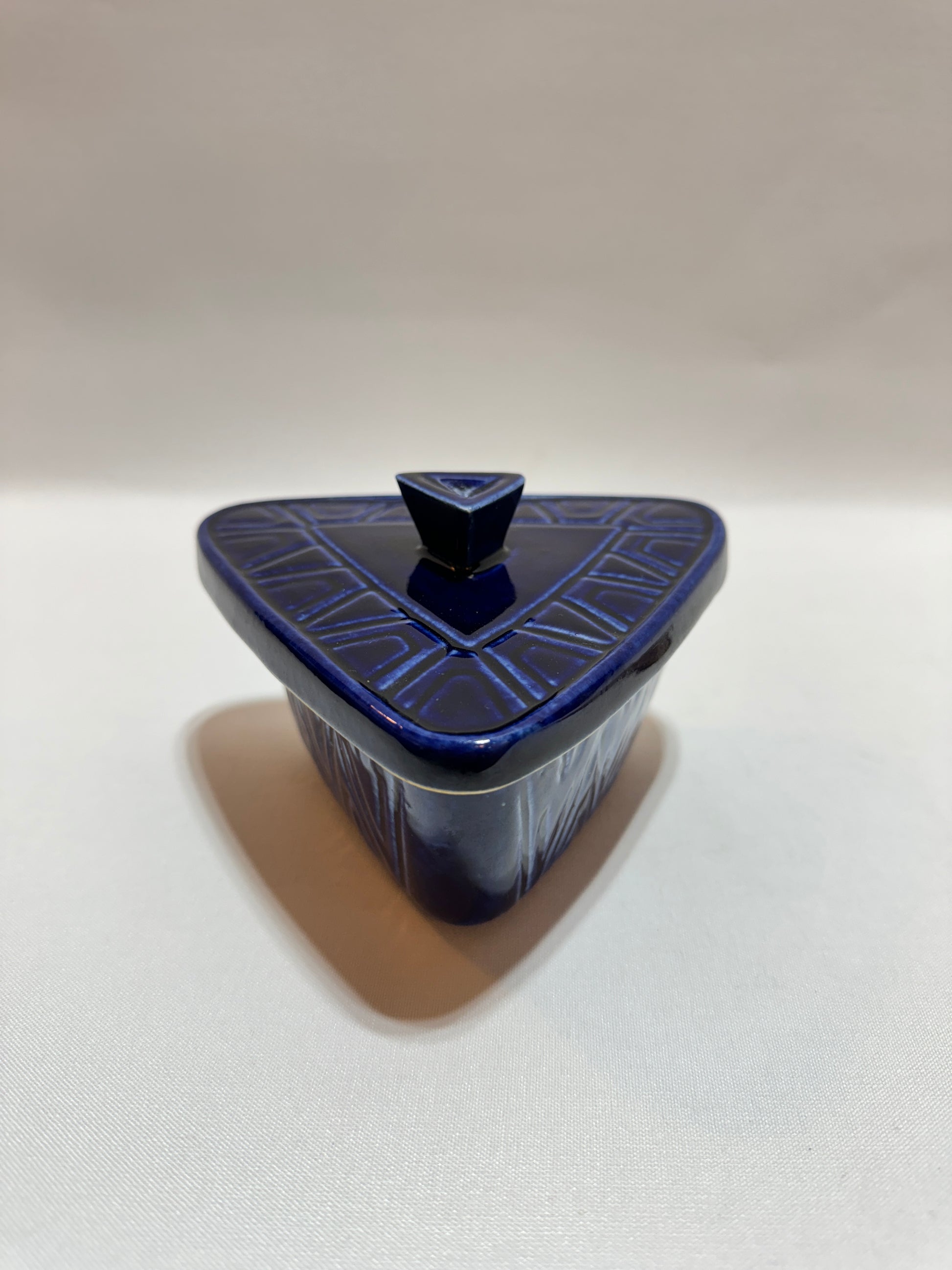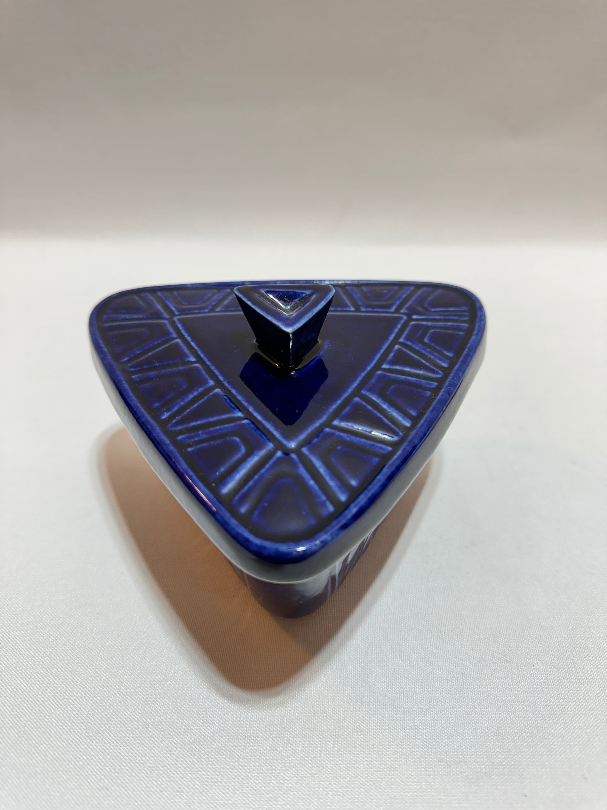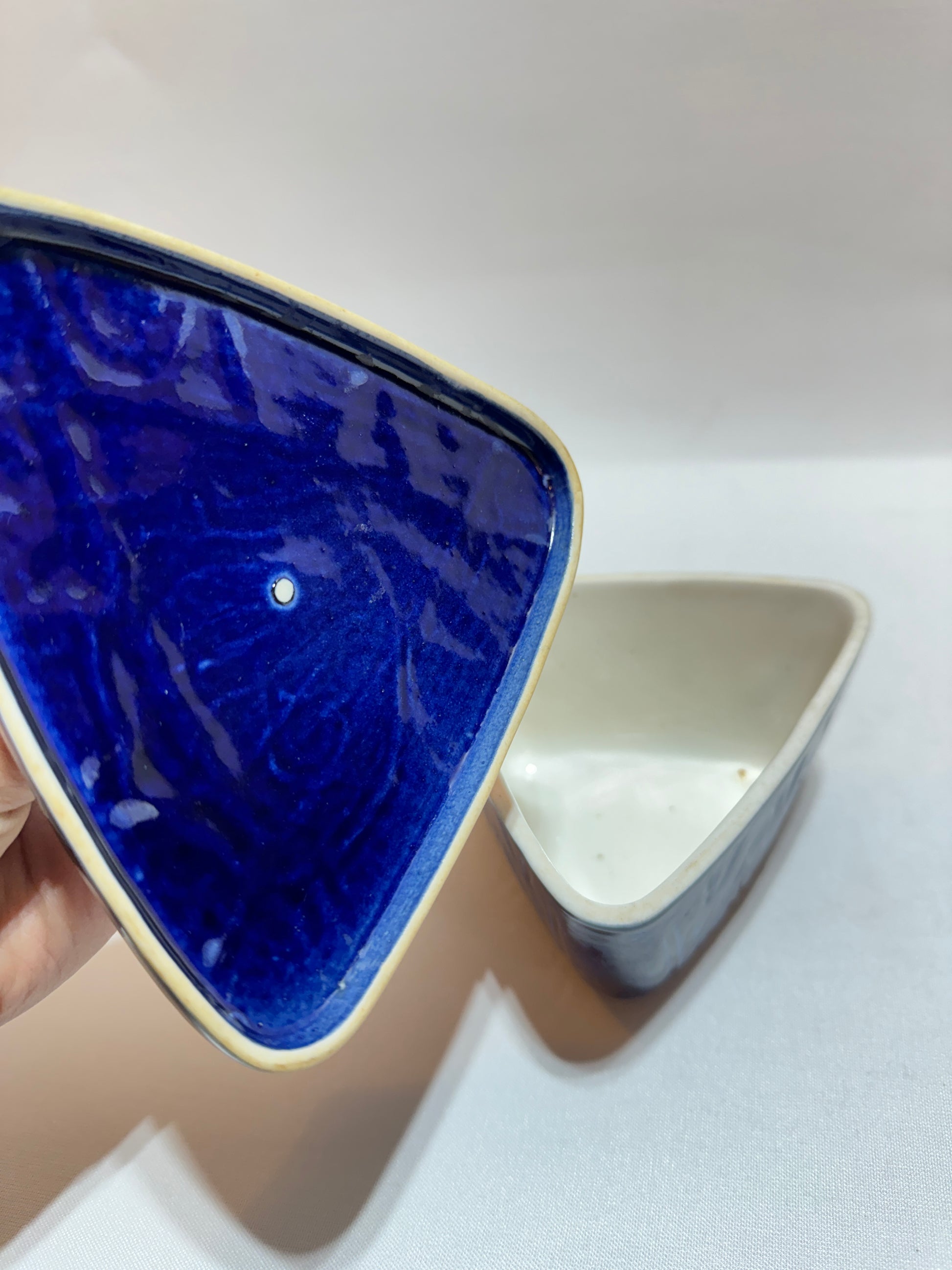 Ca 14 x 13 cm. Höjd 9,5 cm. Havsblå. Okänd formgivare. Invändigt spår av liv. Se foton.