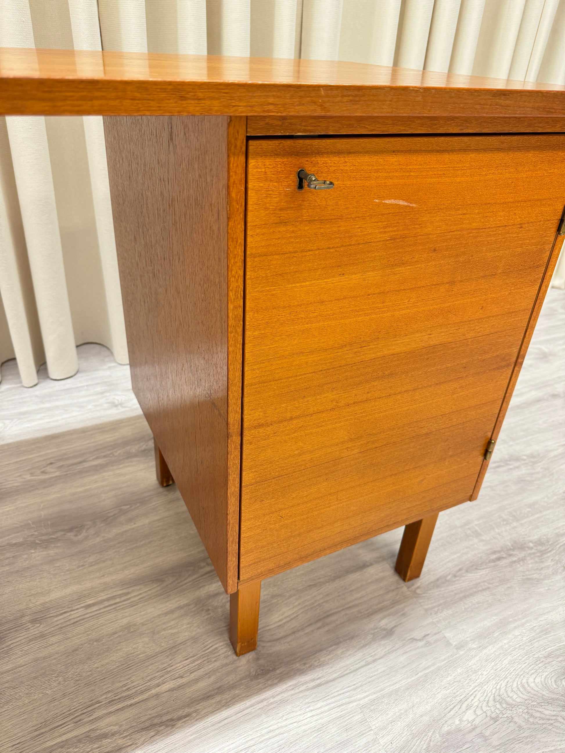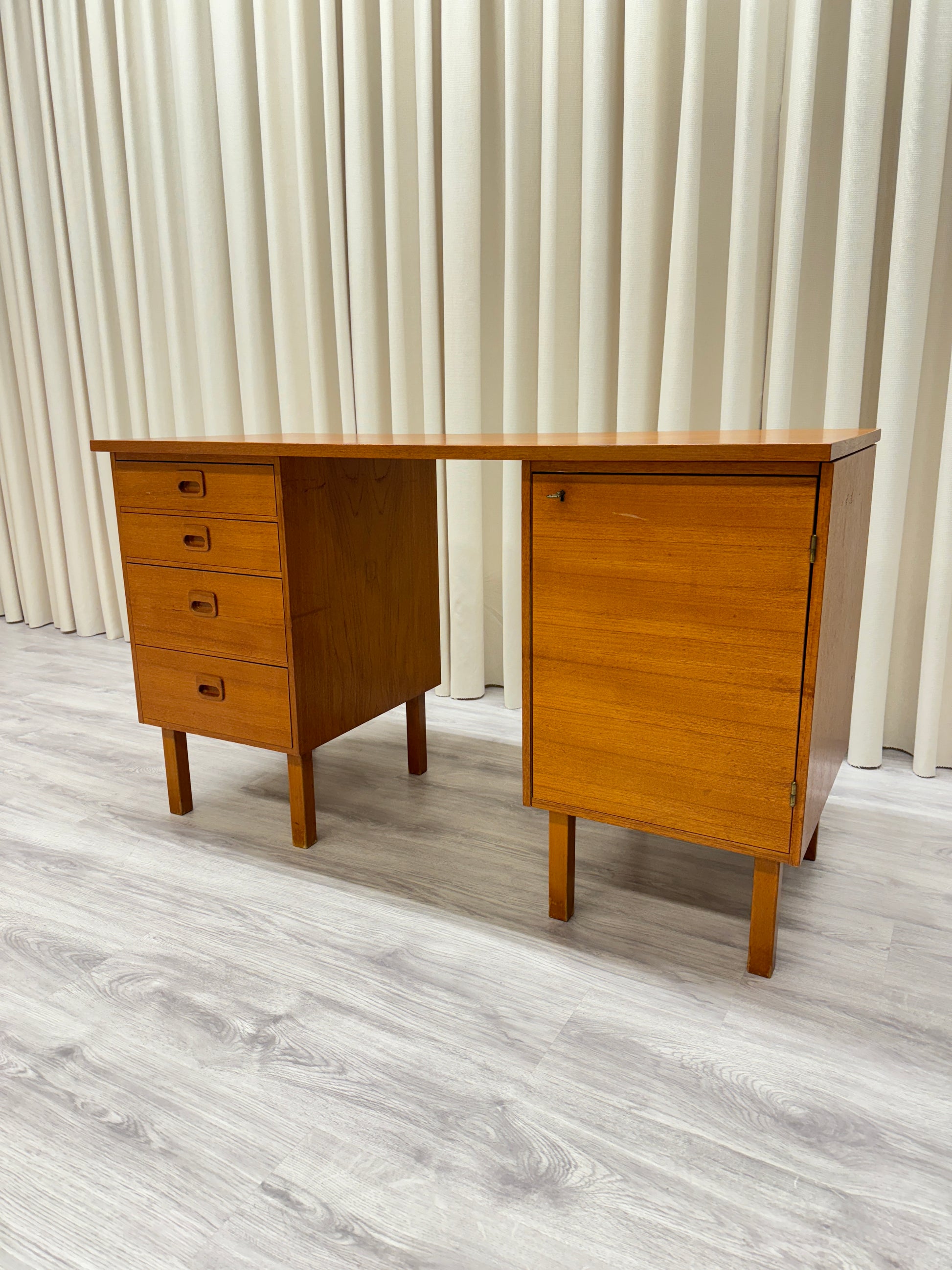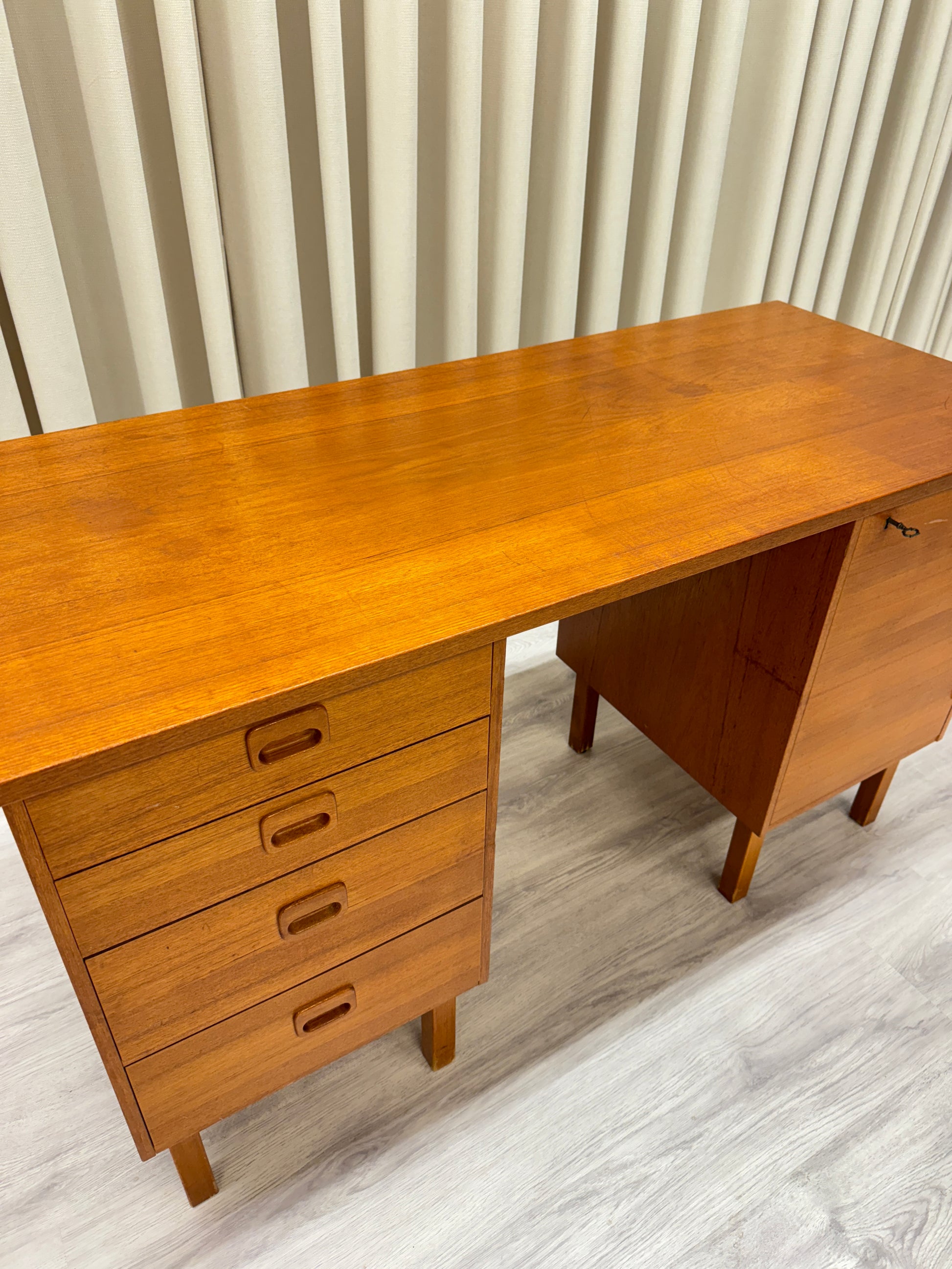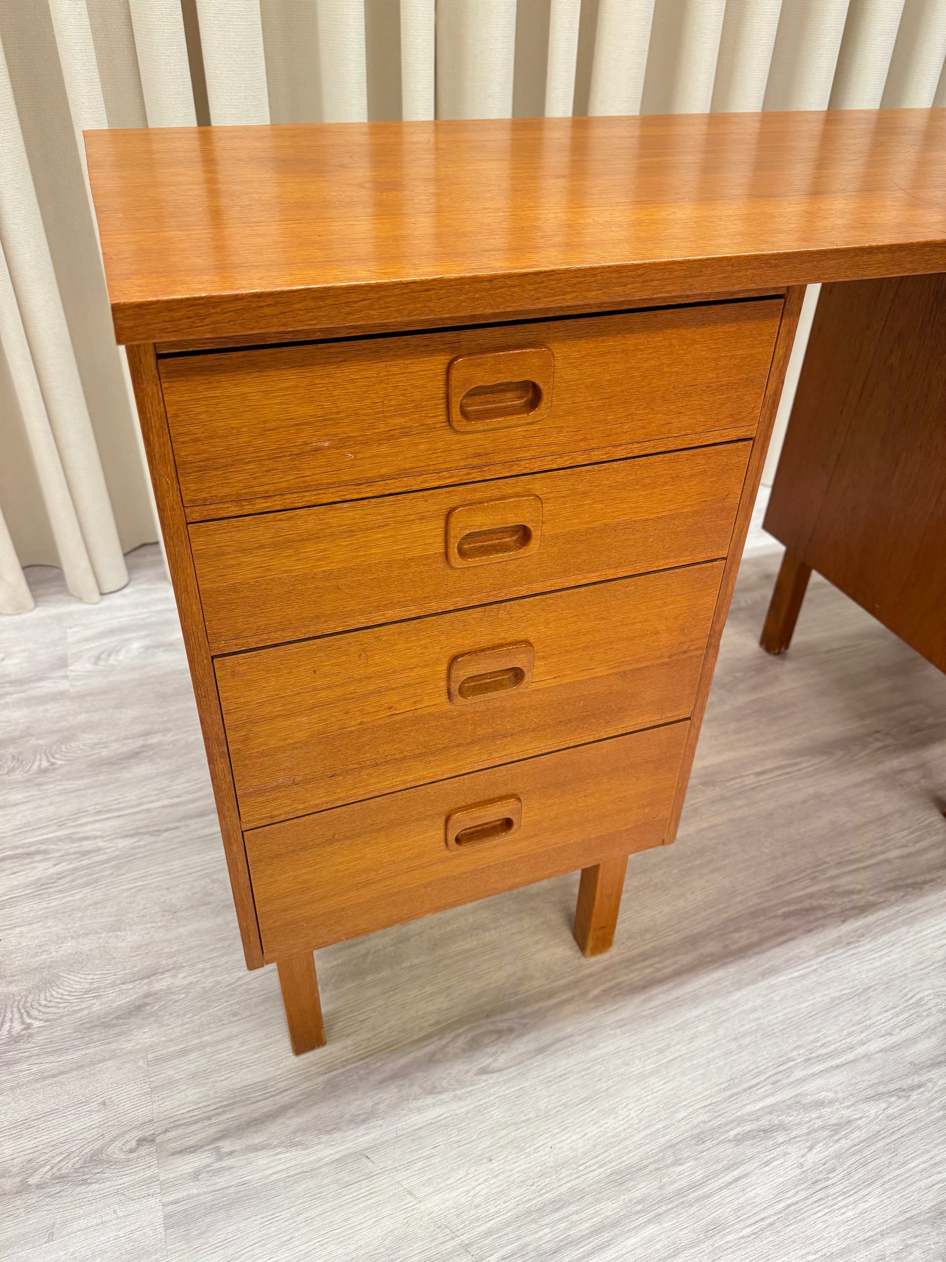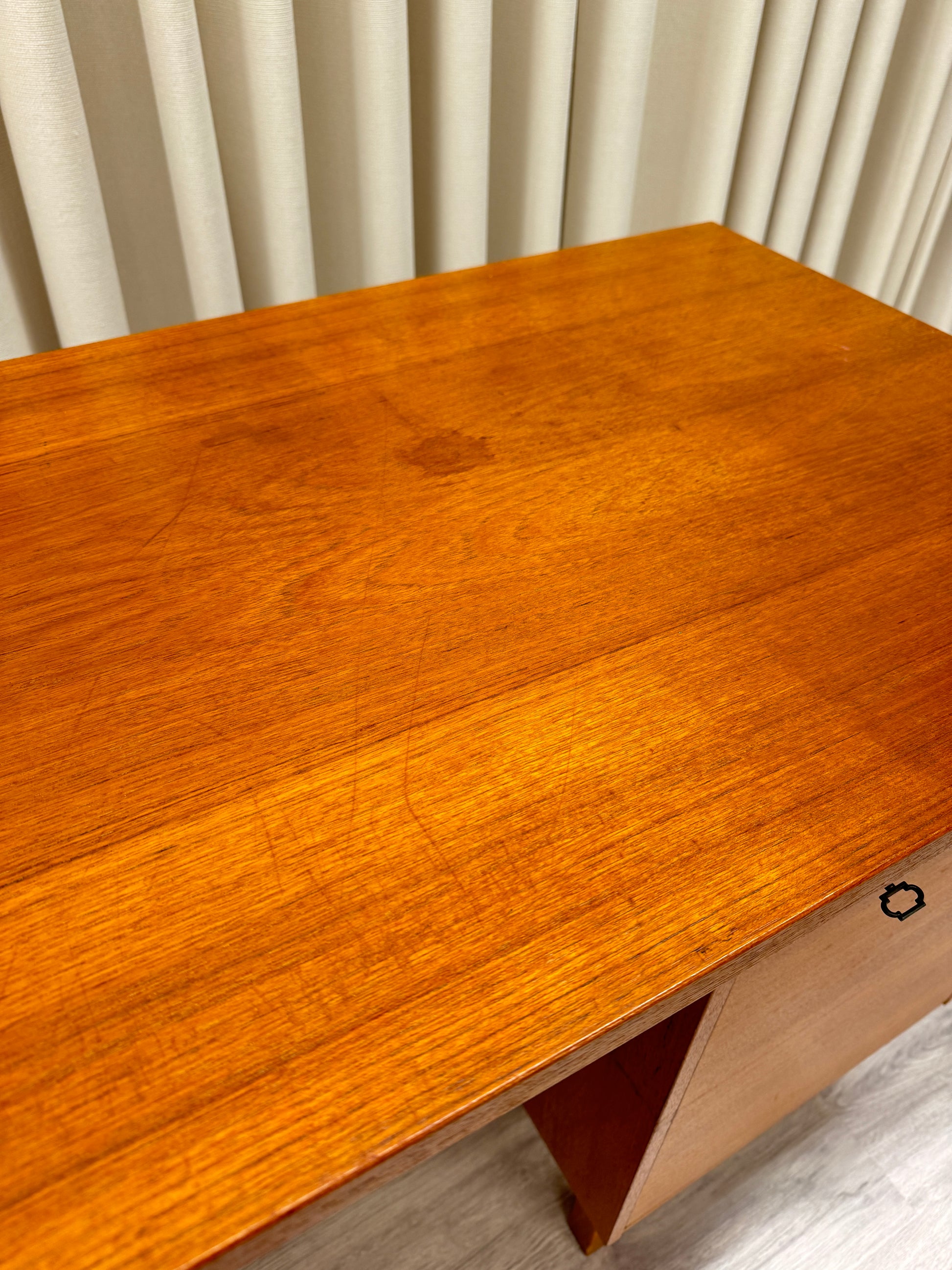 Skrivbordet i teakfaner kommer i tre delar. Spår av liv medföljer såsom repor. Se närmare foton.