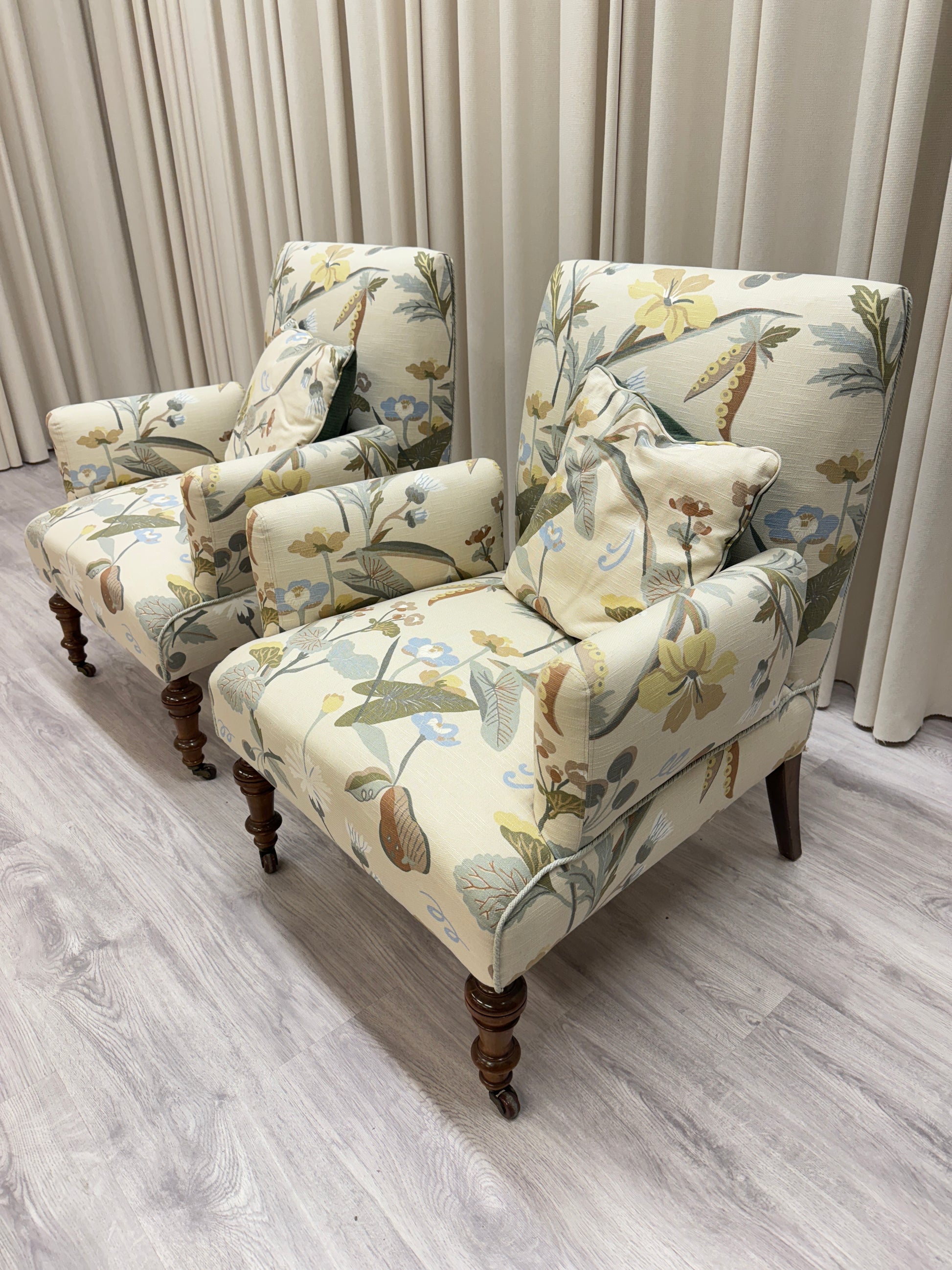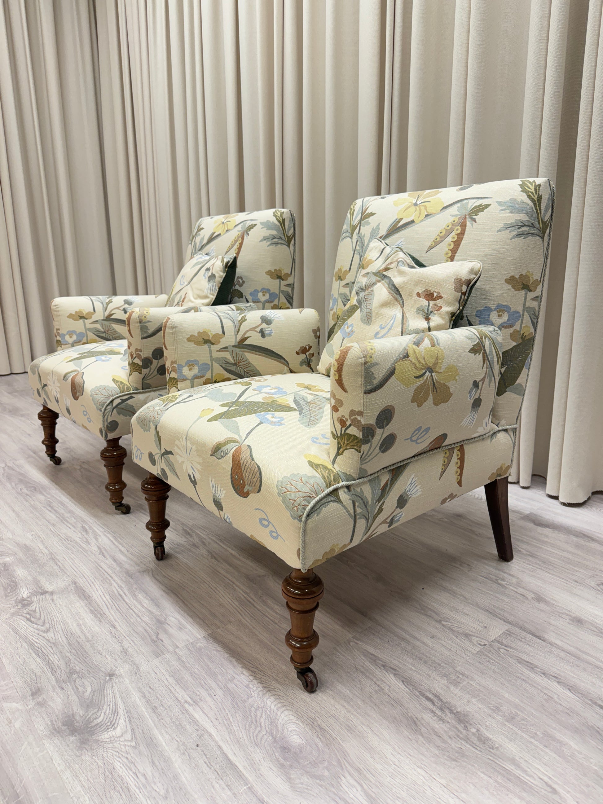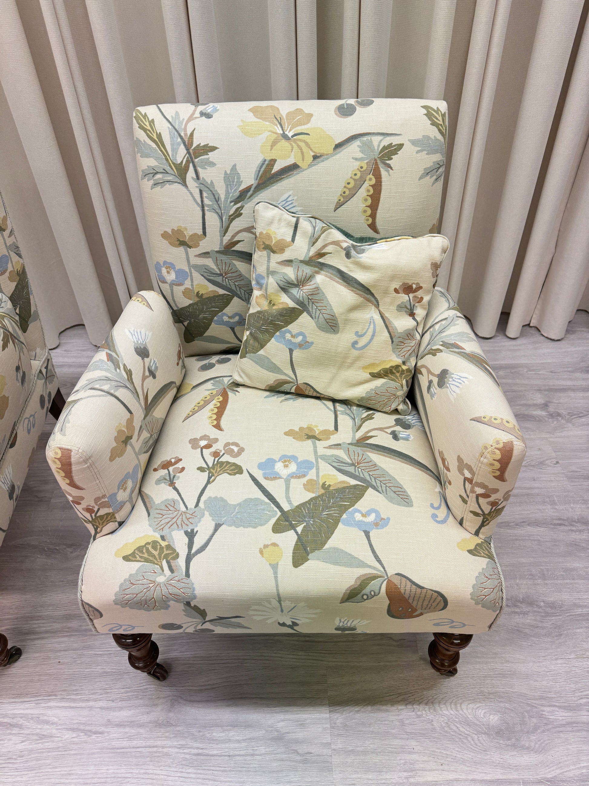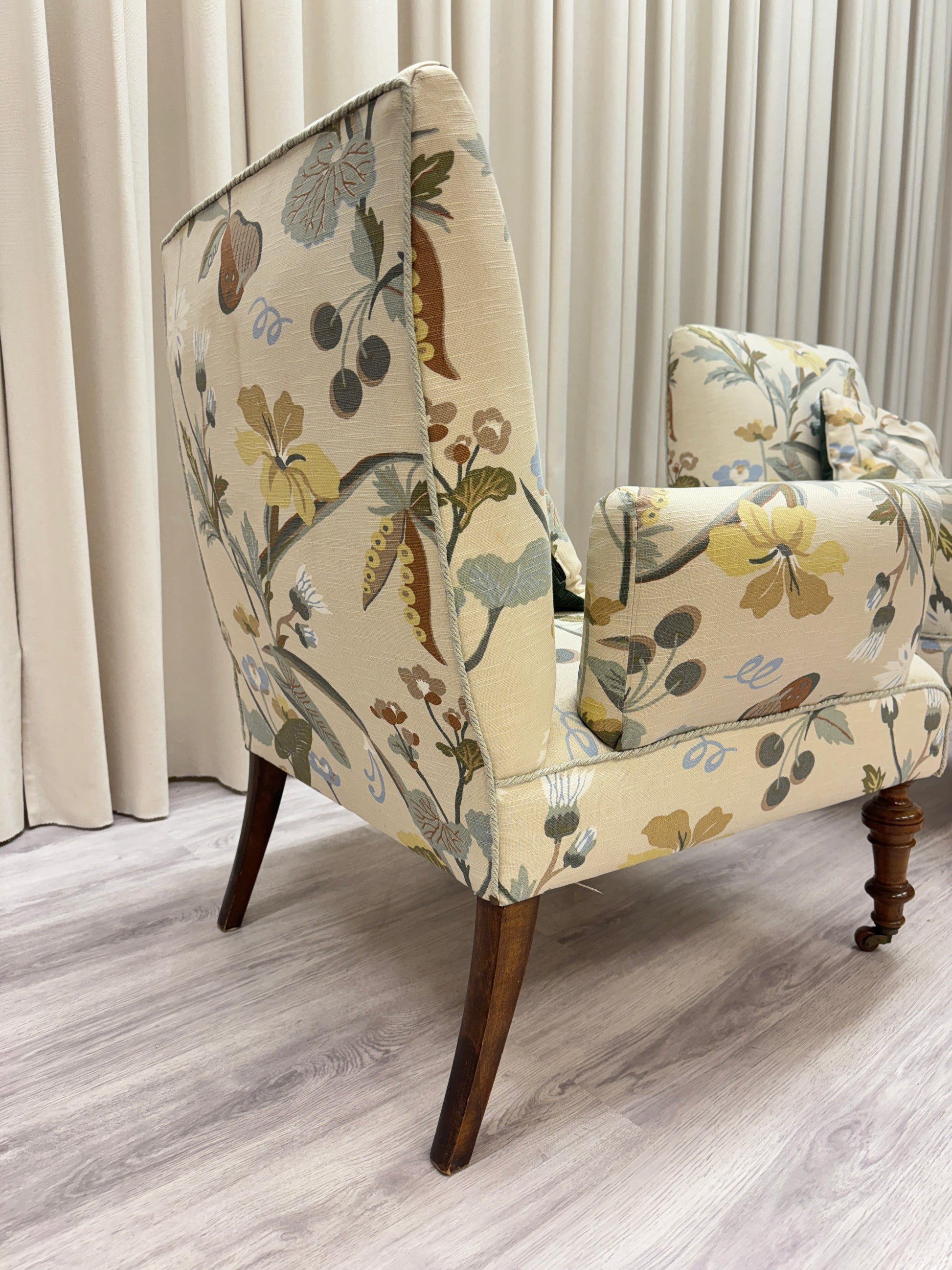 Kan endast hämtas ut i fysisk butik på Södra Kungsgatan 59 i Gävle. Dom blommiga fåtöljerna ifrån sekelskiftet kommer med två hjul där fram. Kudde medkommer. I gott bruksskick! Se foton. Mått: Höjd 85 cm - Sitthöjd 40 cm - Bredd 70 cm - Djup 75 cm.